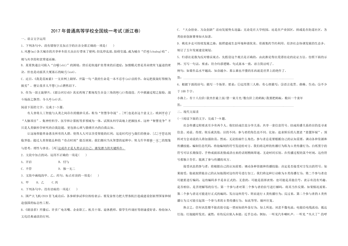 下载2017年浙江省高考语文(含解析版)PDF格式或doc