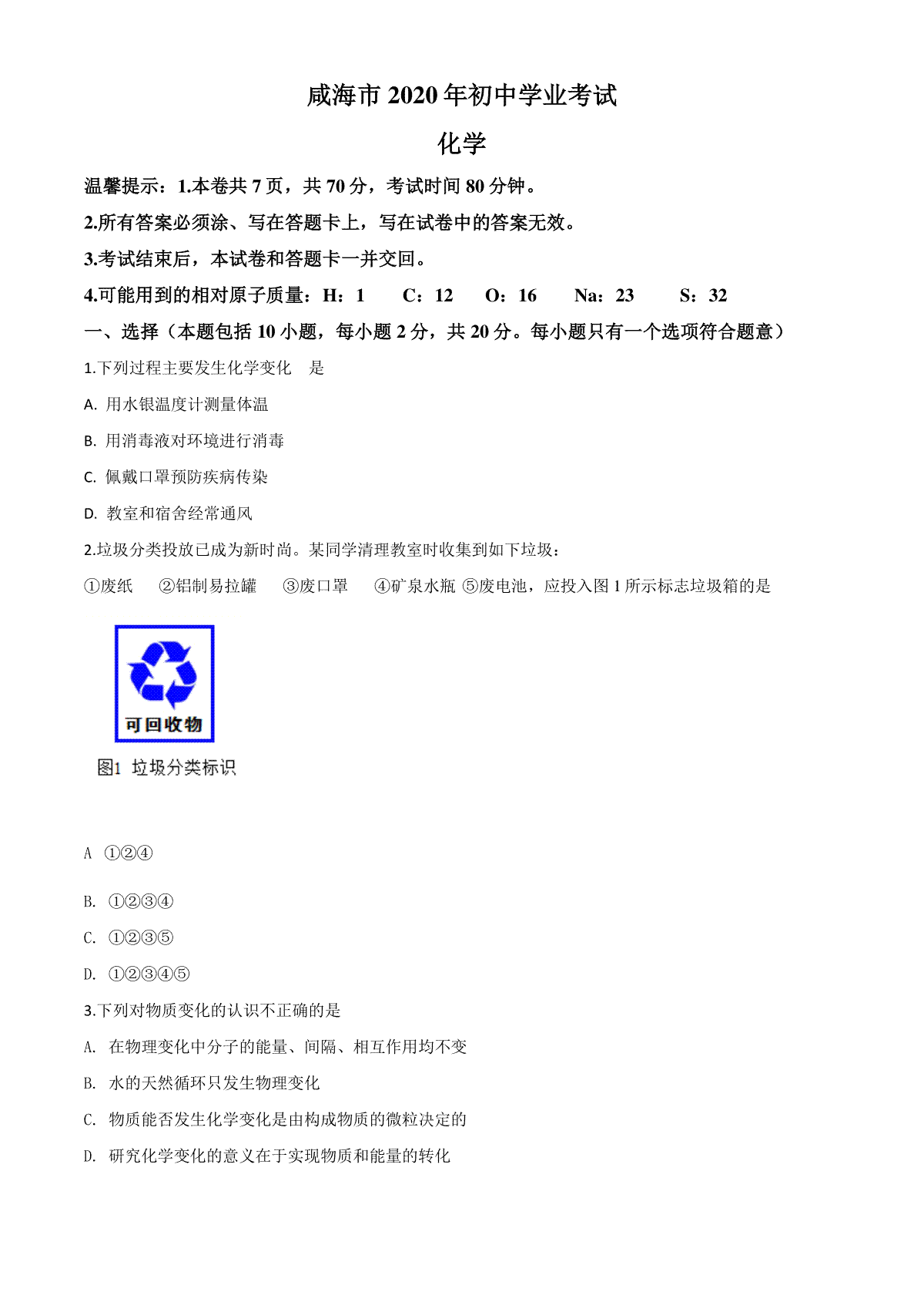 1.精品解析:山东省威海市2020年中考化学试题(原卷版)