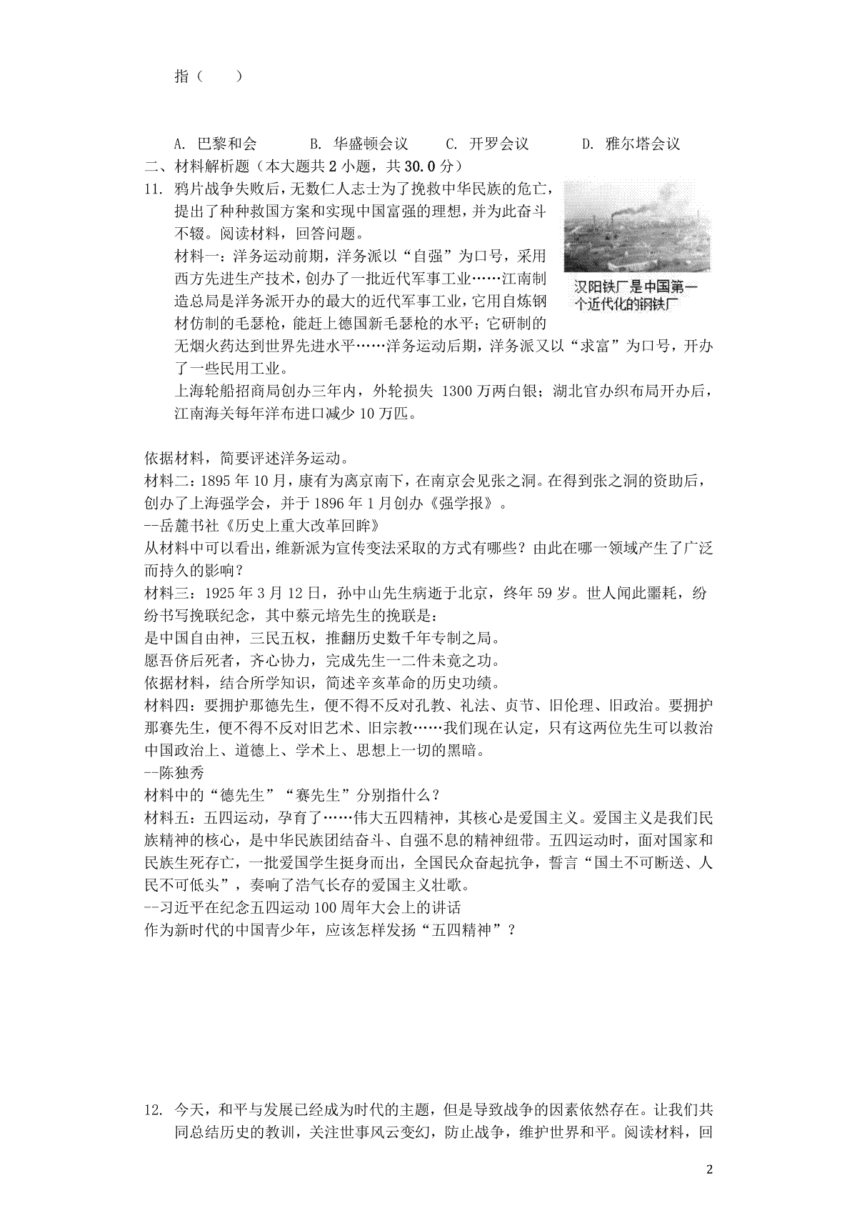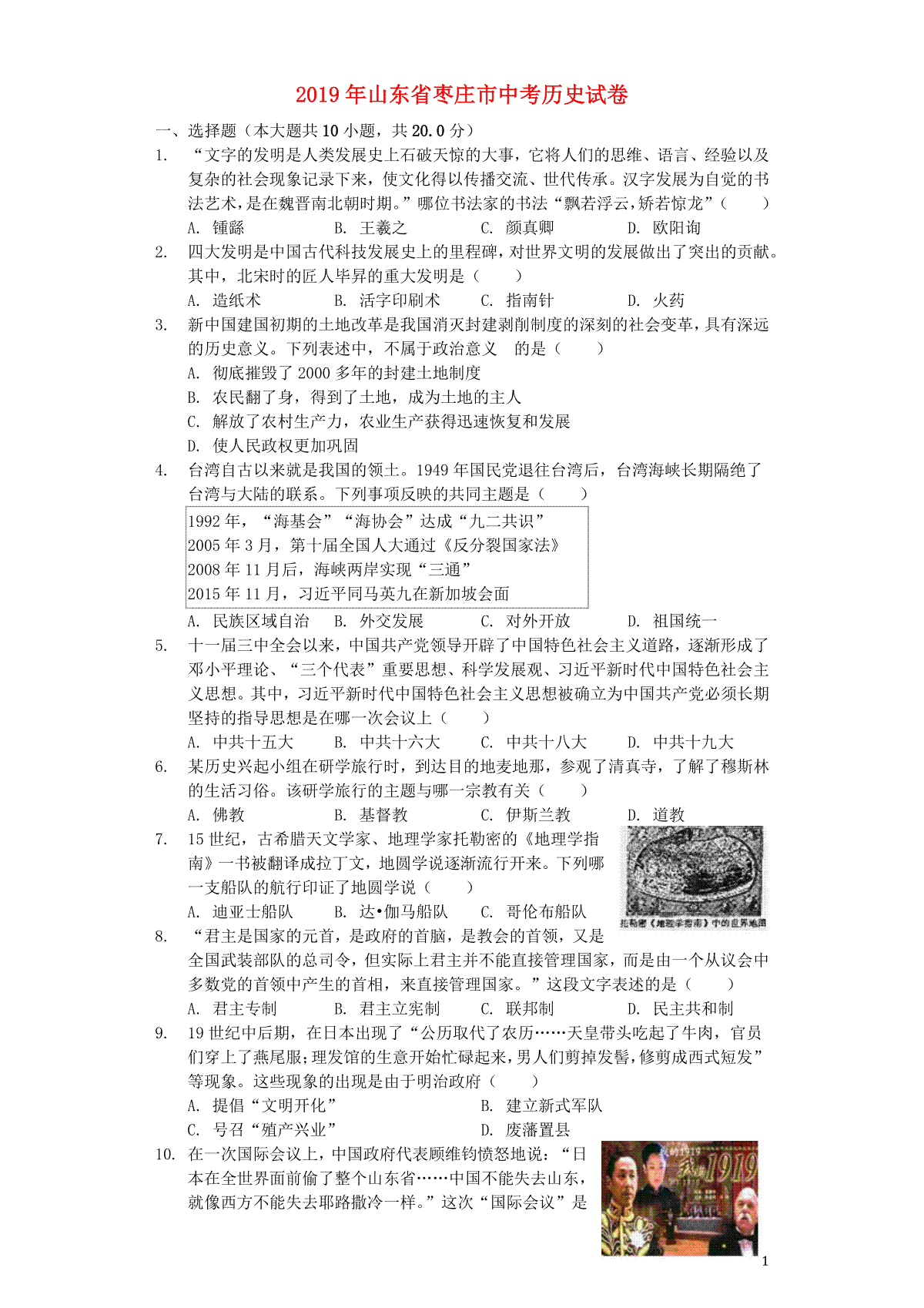 2.山东省枣庄市2019年中考历史真题试题