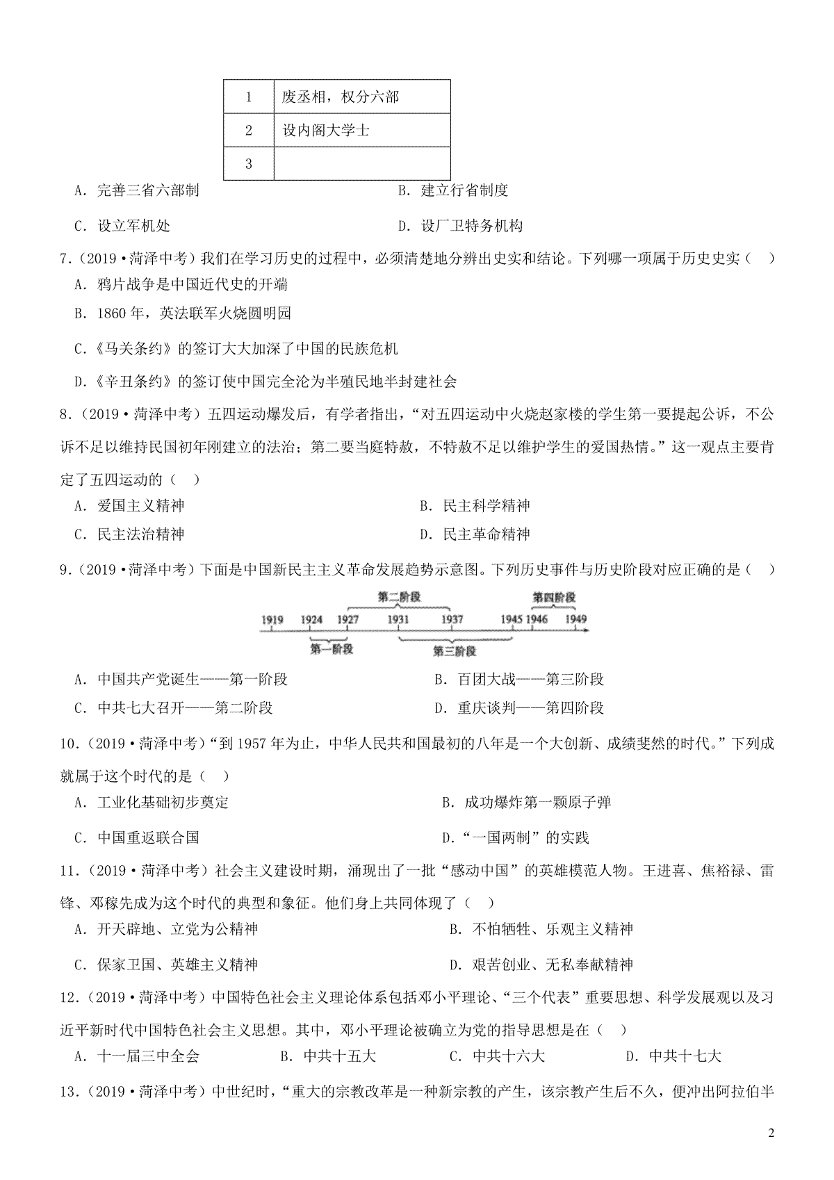 1.山东省菏泽市2019年中考历史真题试题