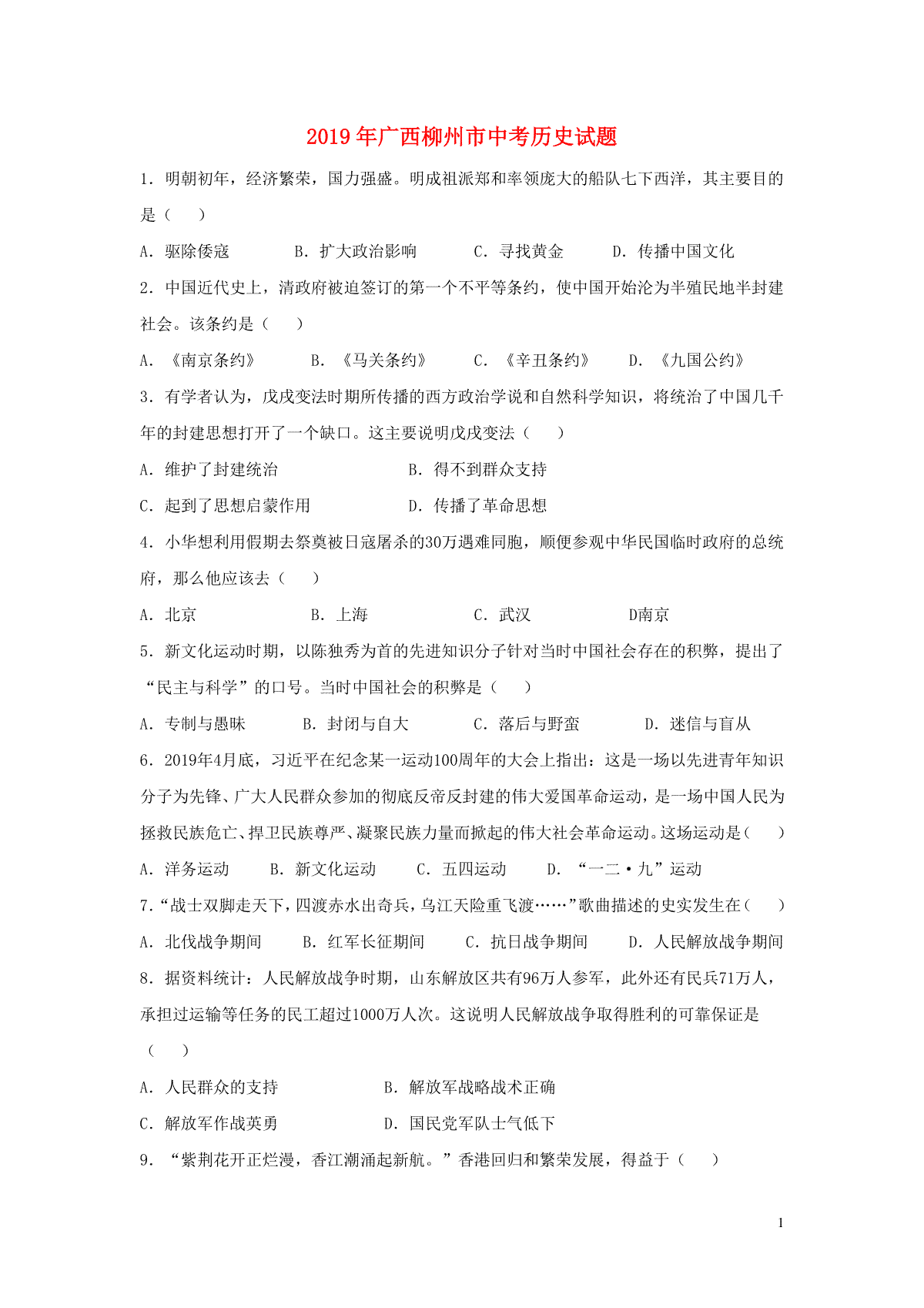 1.广西柳州市2019年中考历史真题试题(含解析)
