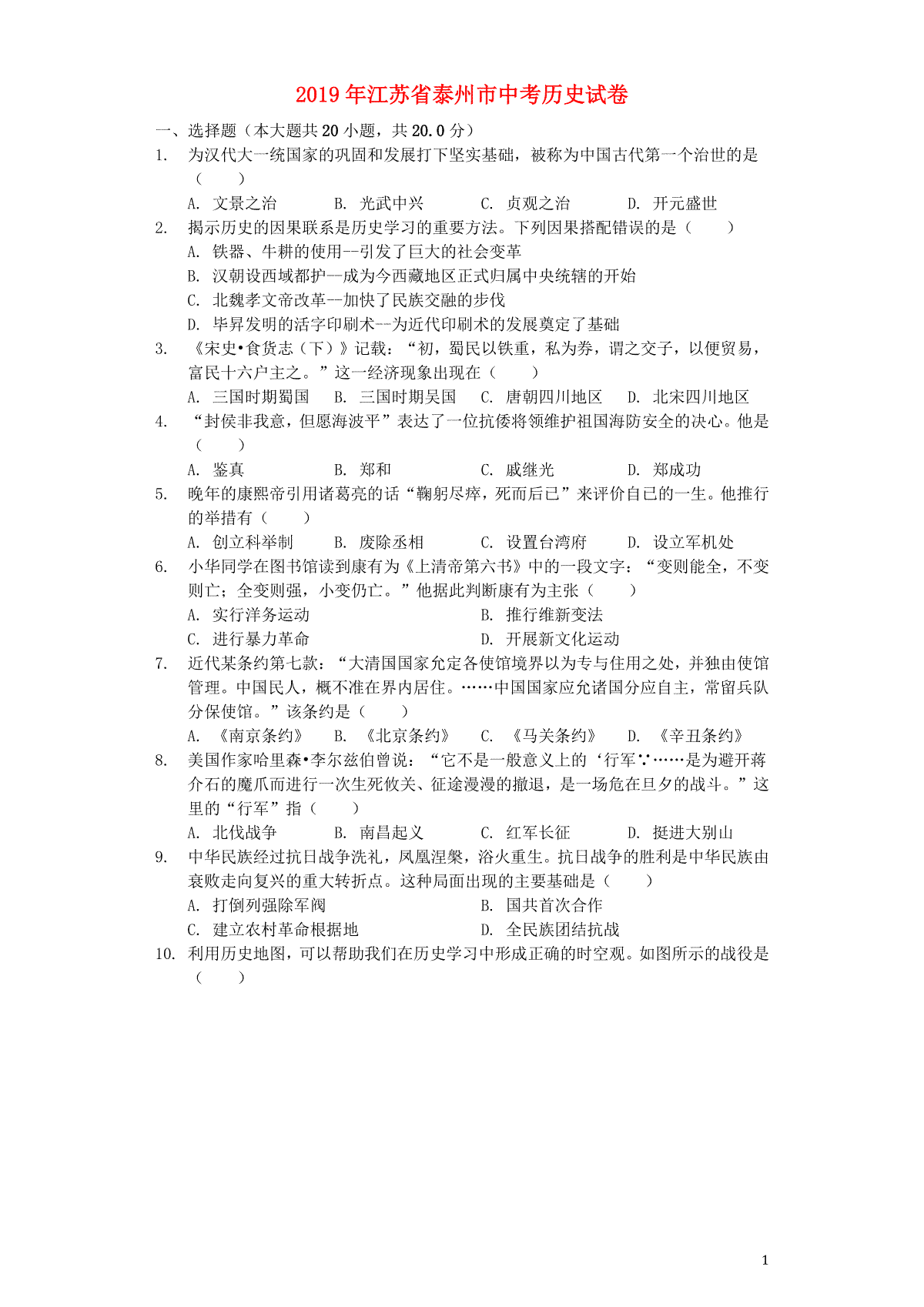 1.2019年江苏省泰州市中考历史试题及参考答案