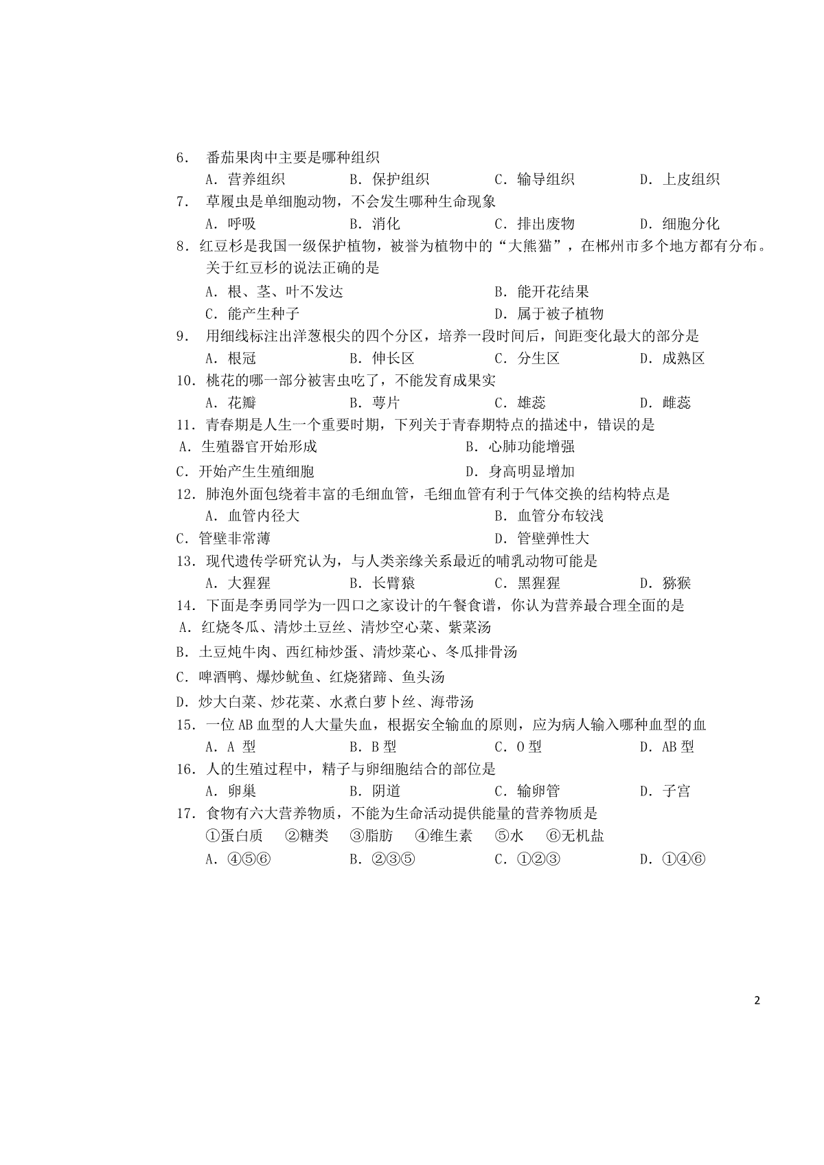 下载湖南省郴州市2019年中考生物真题试题PDF格式或doc