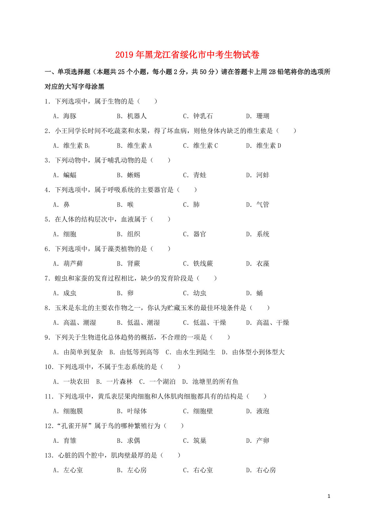 1.黑龙江省绥化市2019年中考生物真题试题(含解析)