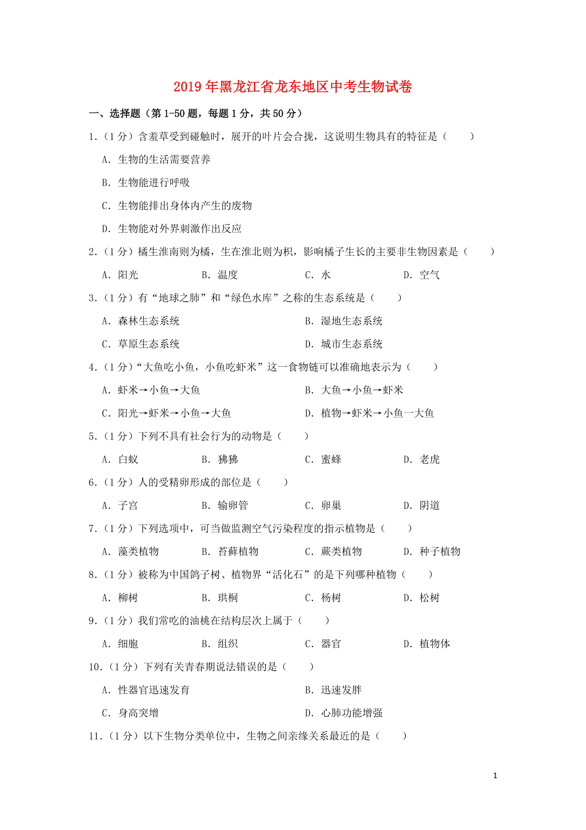 1.黑龙江省龙东地区2019年中考生物真题试题(含解析)