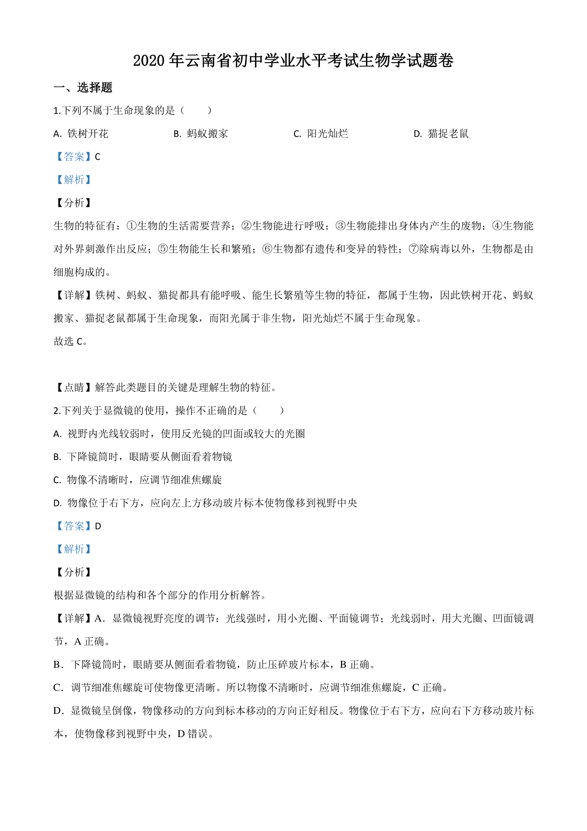 1.精品解析:云南省2020年中考生物试题(解析版)