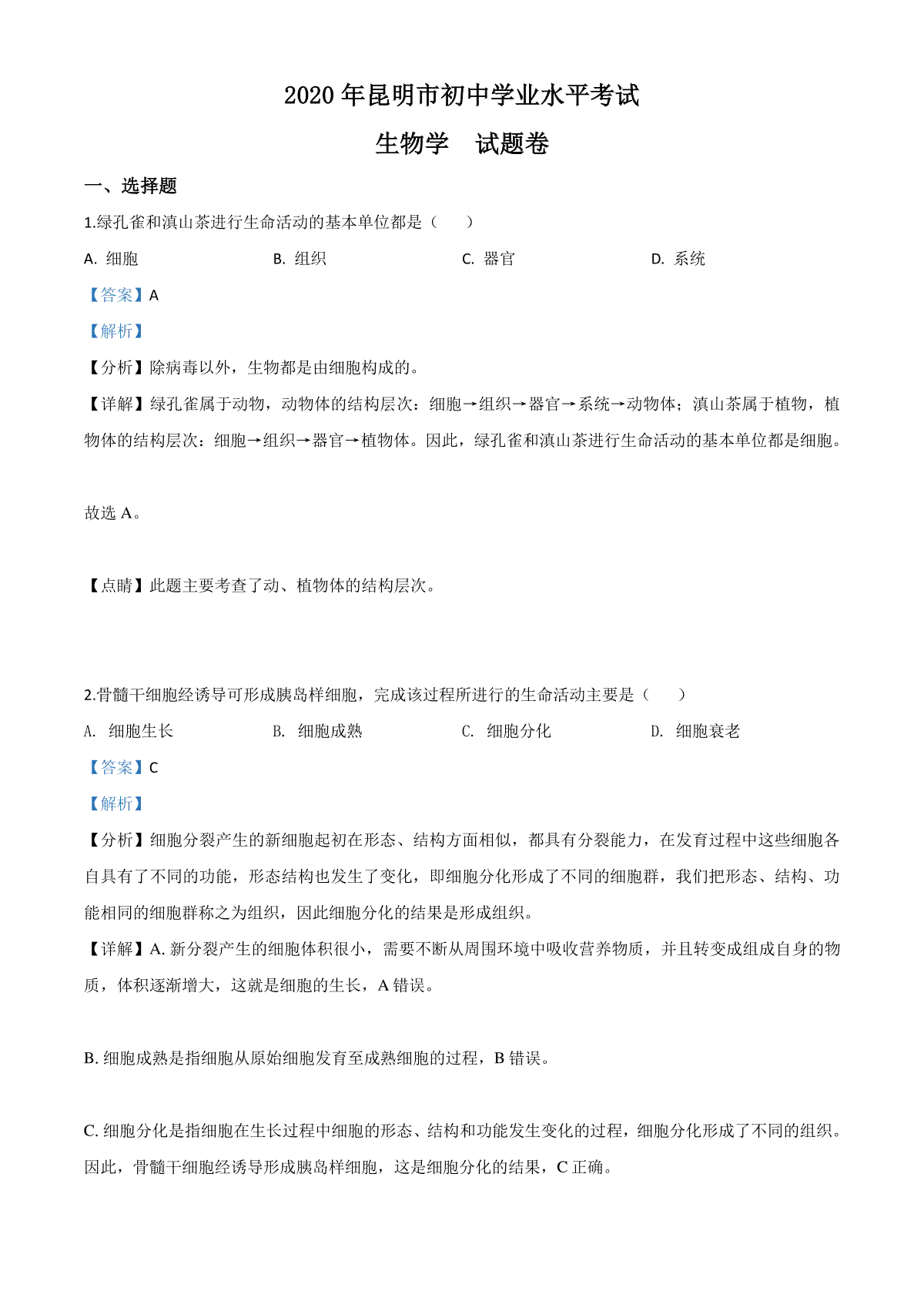 1.精品解析:云南省昆明市2020年中考生物试题(解析版)