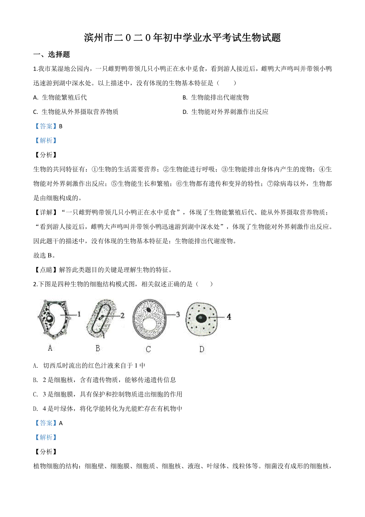 1.精品解析:山东省滨州市2020年中考生物试题(解析版)