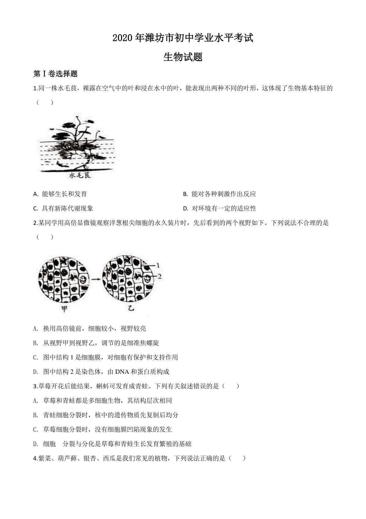 一、精品解析:山东省潍坊市2020年中考生物试题(原卷版)