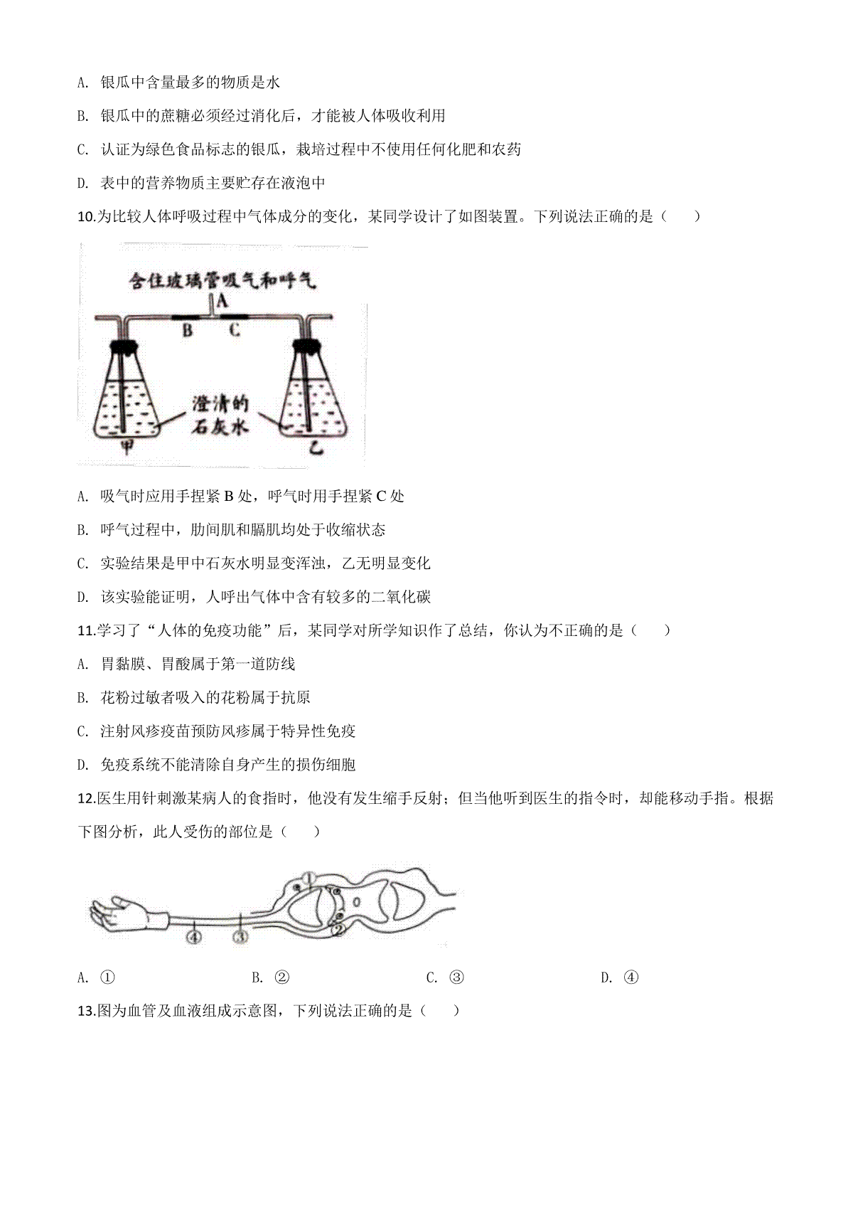 3.精品解析:山东省滨州市2020年中考生物试题(原卷版)