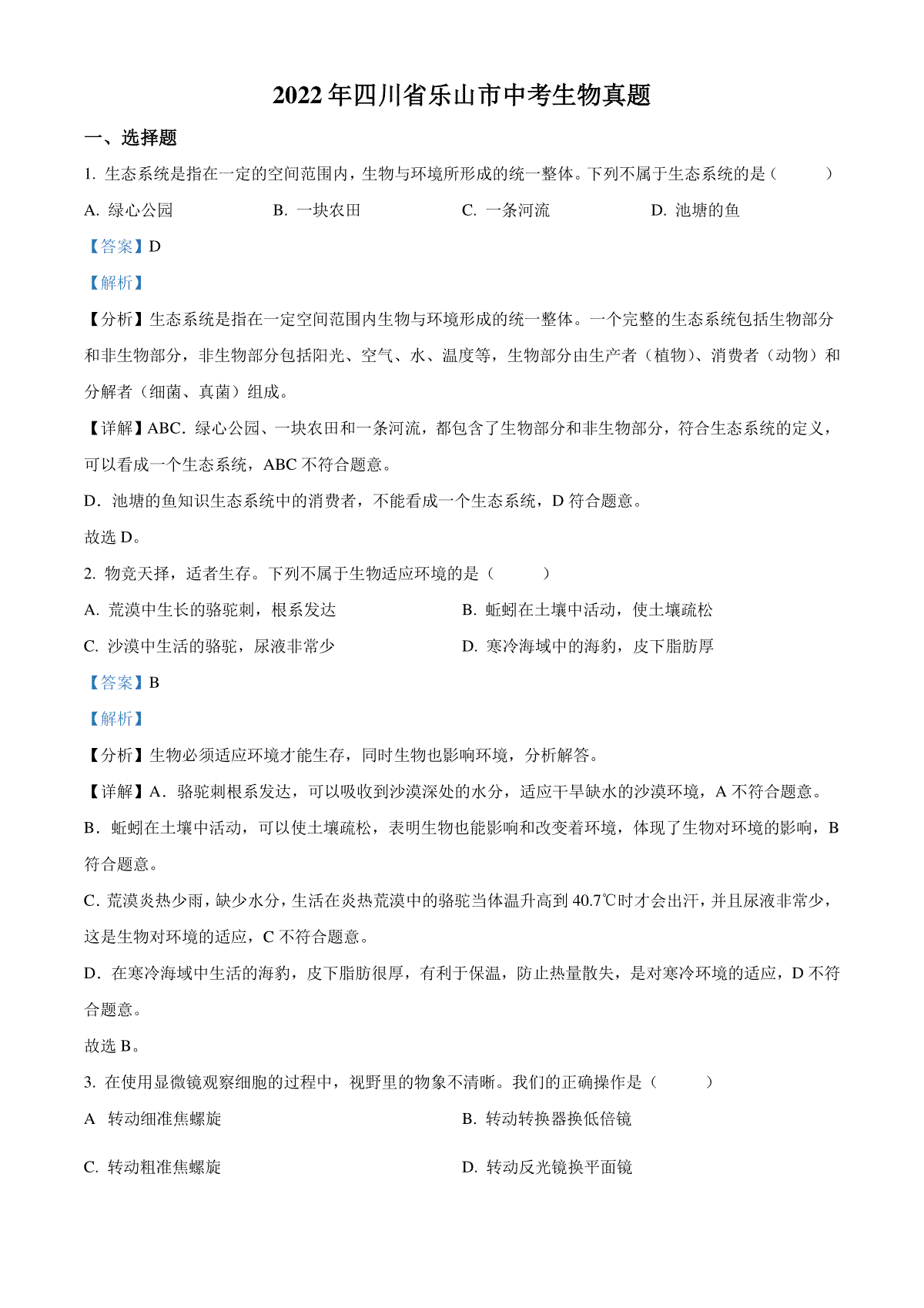 一、精品解析:2022年四川省乐山市中考生物真题(解析版)