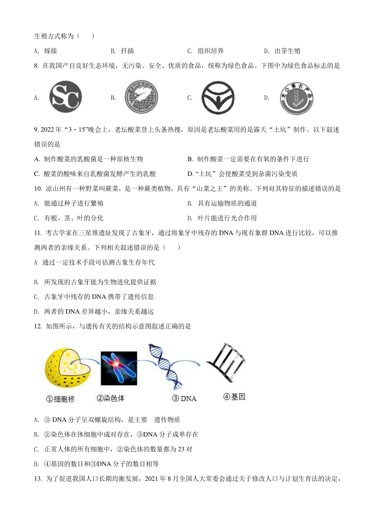一、精品解析:2022年四川省凉山州中考生物真题(原卷版)