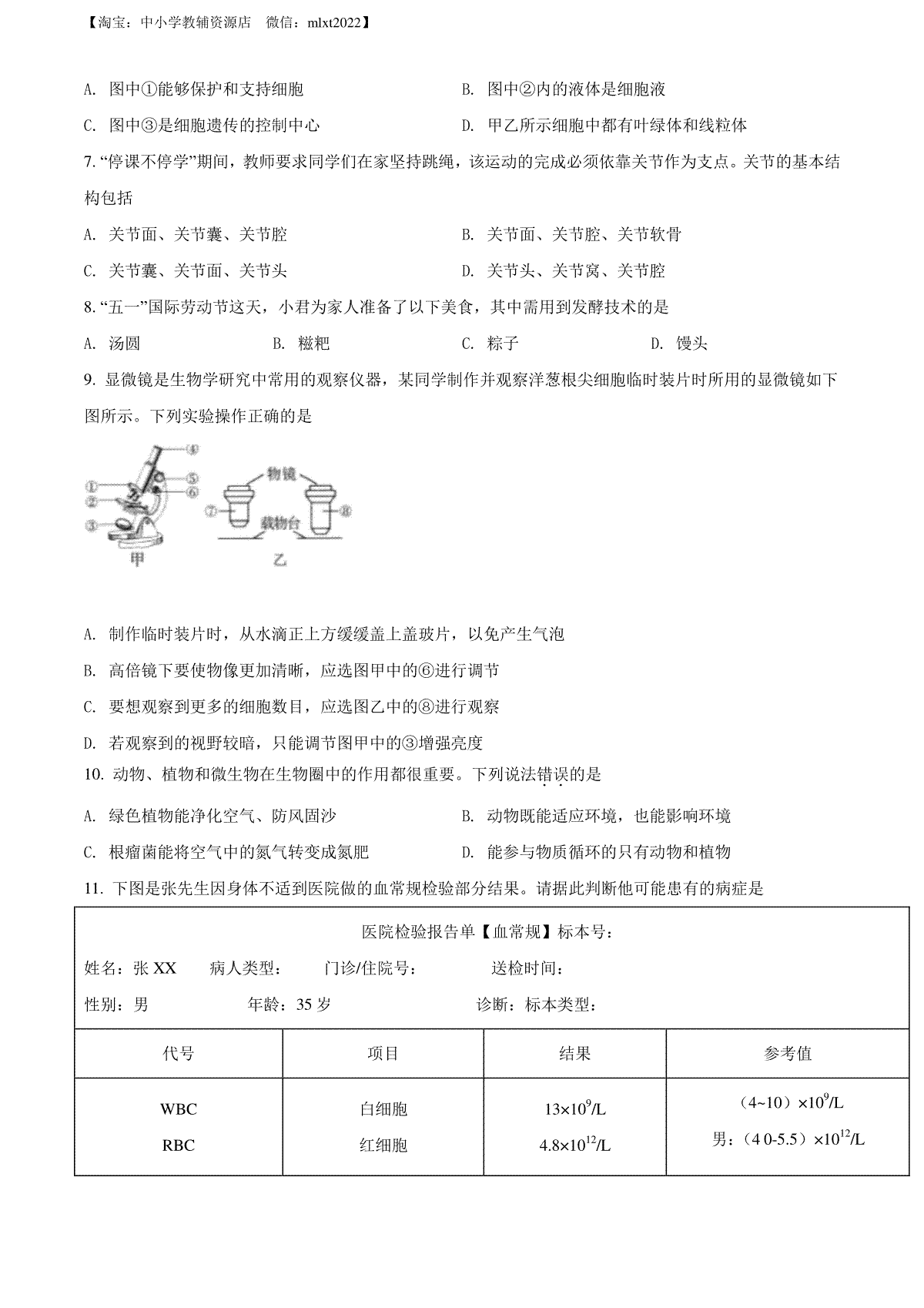 7.精品解析:2022年吉林省大安市中考生物真题(原卷版)(1)