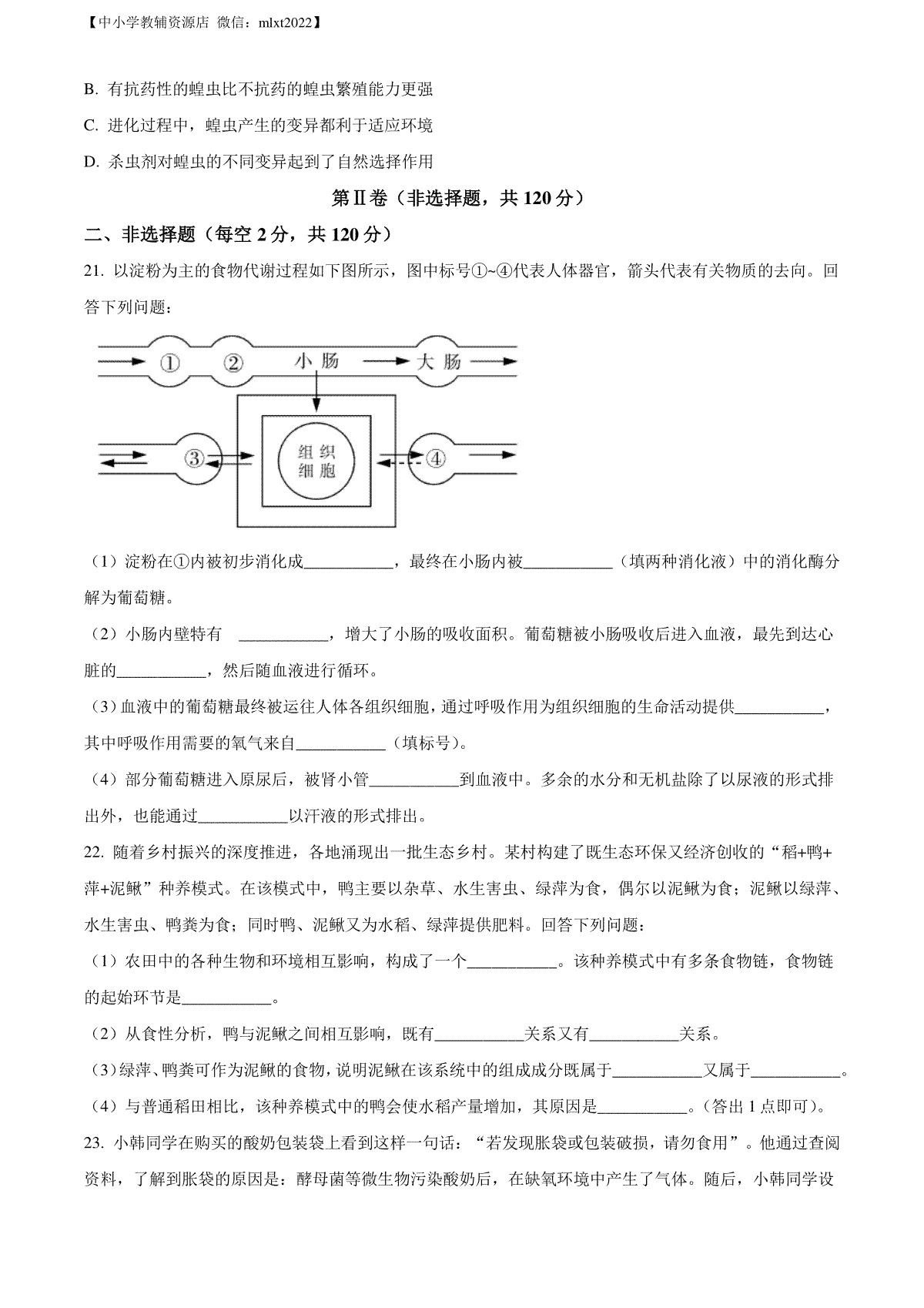 精品解析:2022年四川省绵阳市中考生物真题(原卷版)