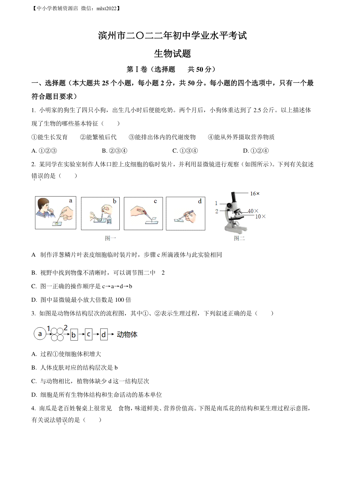 一、精品解析:2022年山东省滨州市中考生物真题(原卷版)