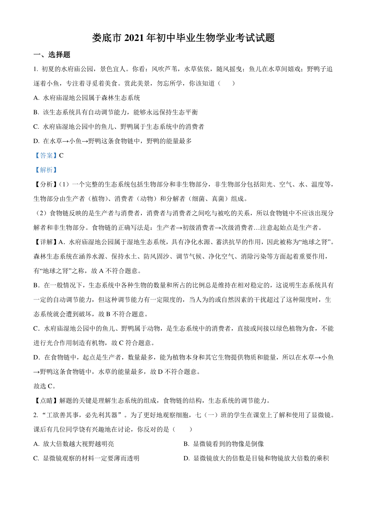 一、精品解析:湖南省娄底市2021年中考生物试题(解析版)