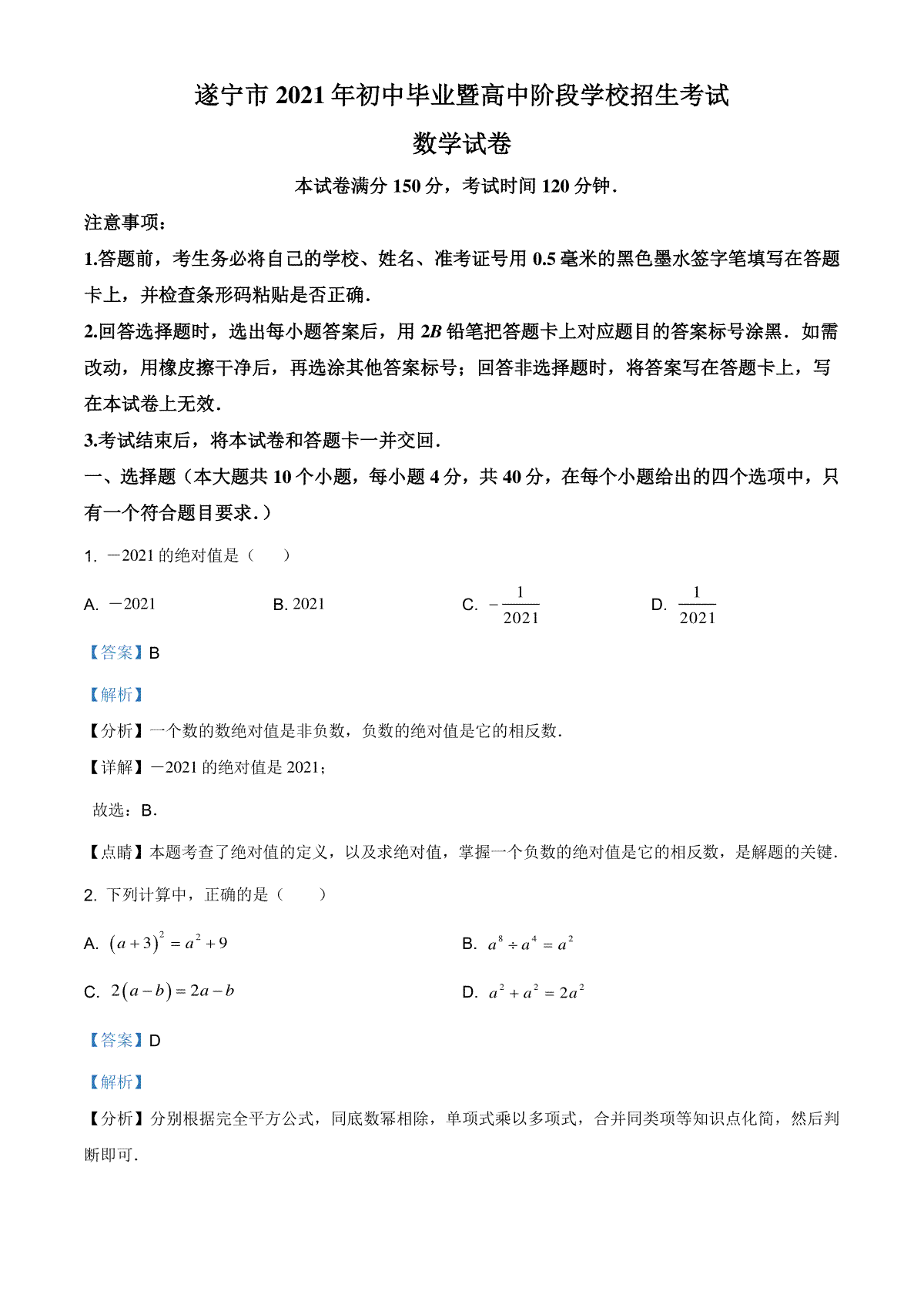 精品解析:四川省遂宁市2021年中考数学真题(解析版)