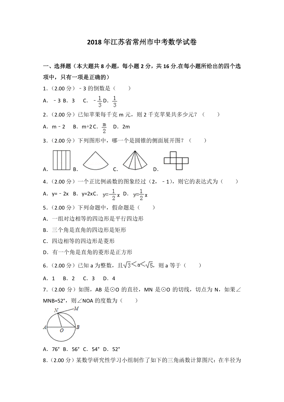 下载2018年常州市中考数学试题及答案PDF格式或doc