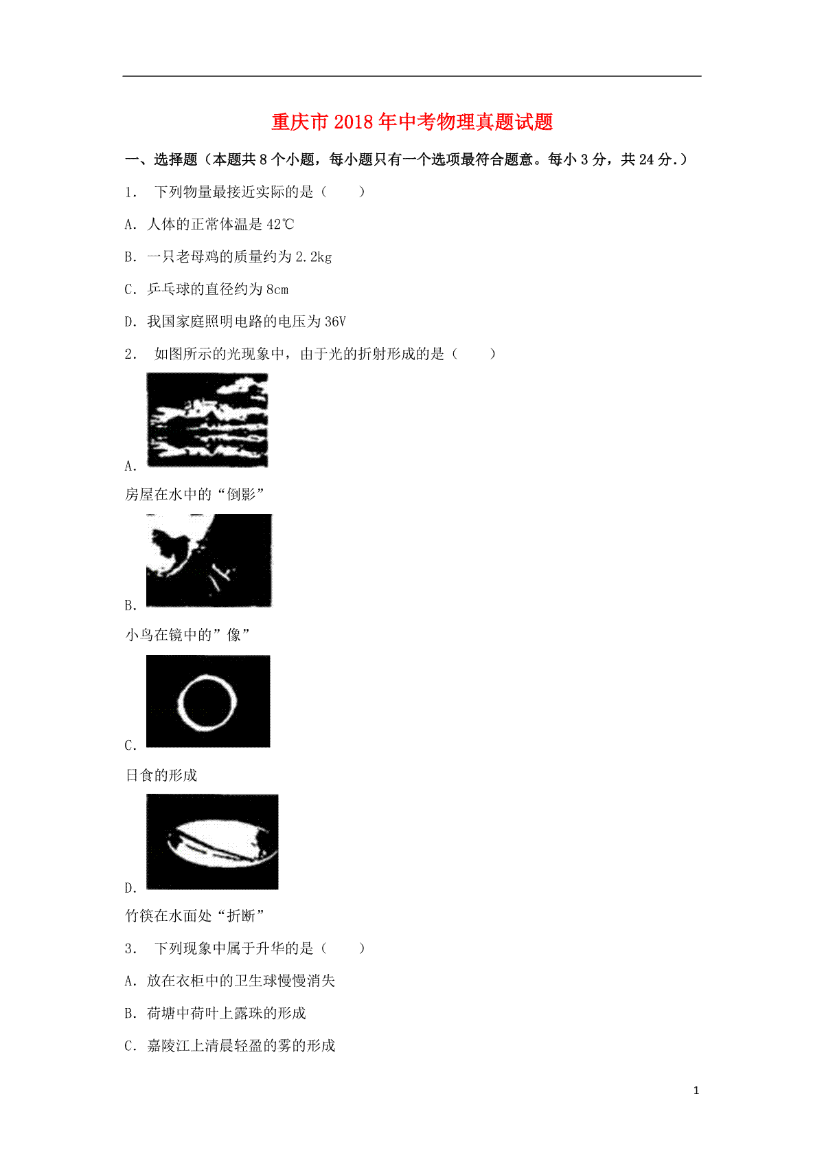1.重庆市2018年中考物理真题试题(A卷,含解析)