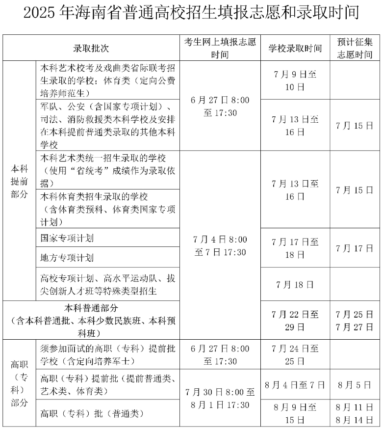 2025海南高考各批次录取时间已经公布,2025海南高考投档录取状态公布时间根据批次不同而有所差异,主要集中于7月9日至8月15日。考生需根据报考批次在对应时间段内查询结果,并关注志愿填报、征集志愿等后续安排。