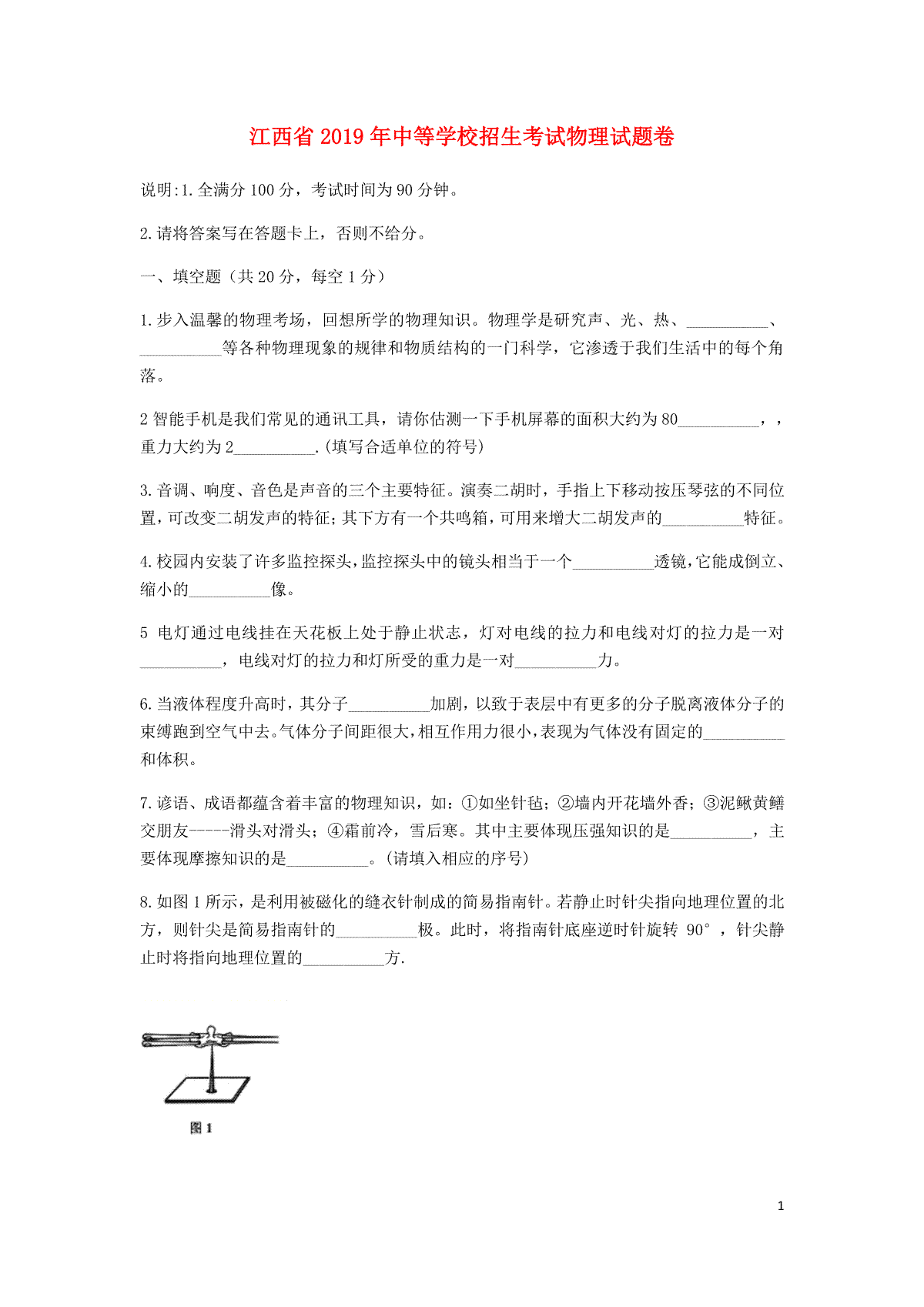 下载江西省2019年中考物理真题试题PDF格式或doc