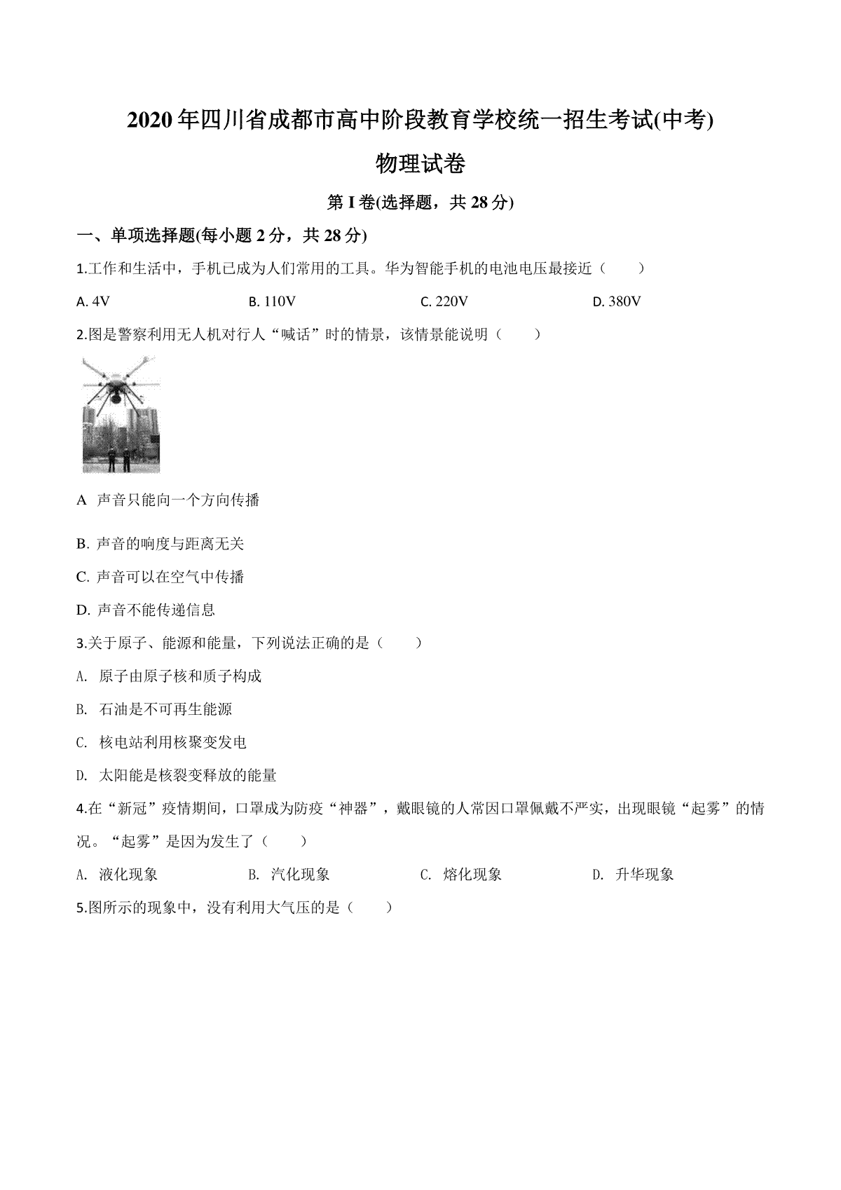 1.精品解析:2020年四川省成都市中考物理试题(高中阶段教育学校统一招生考试)(原卷版)