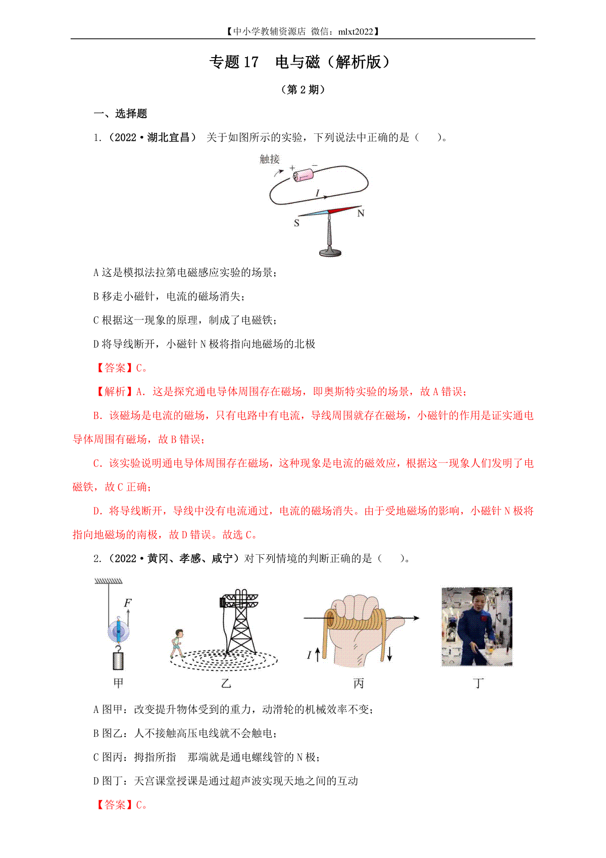 如果你想下载专题17 电与磁(解析版)(第2期)DOC或PDF版,请点击本文末链接!
