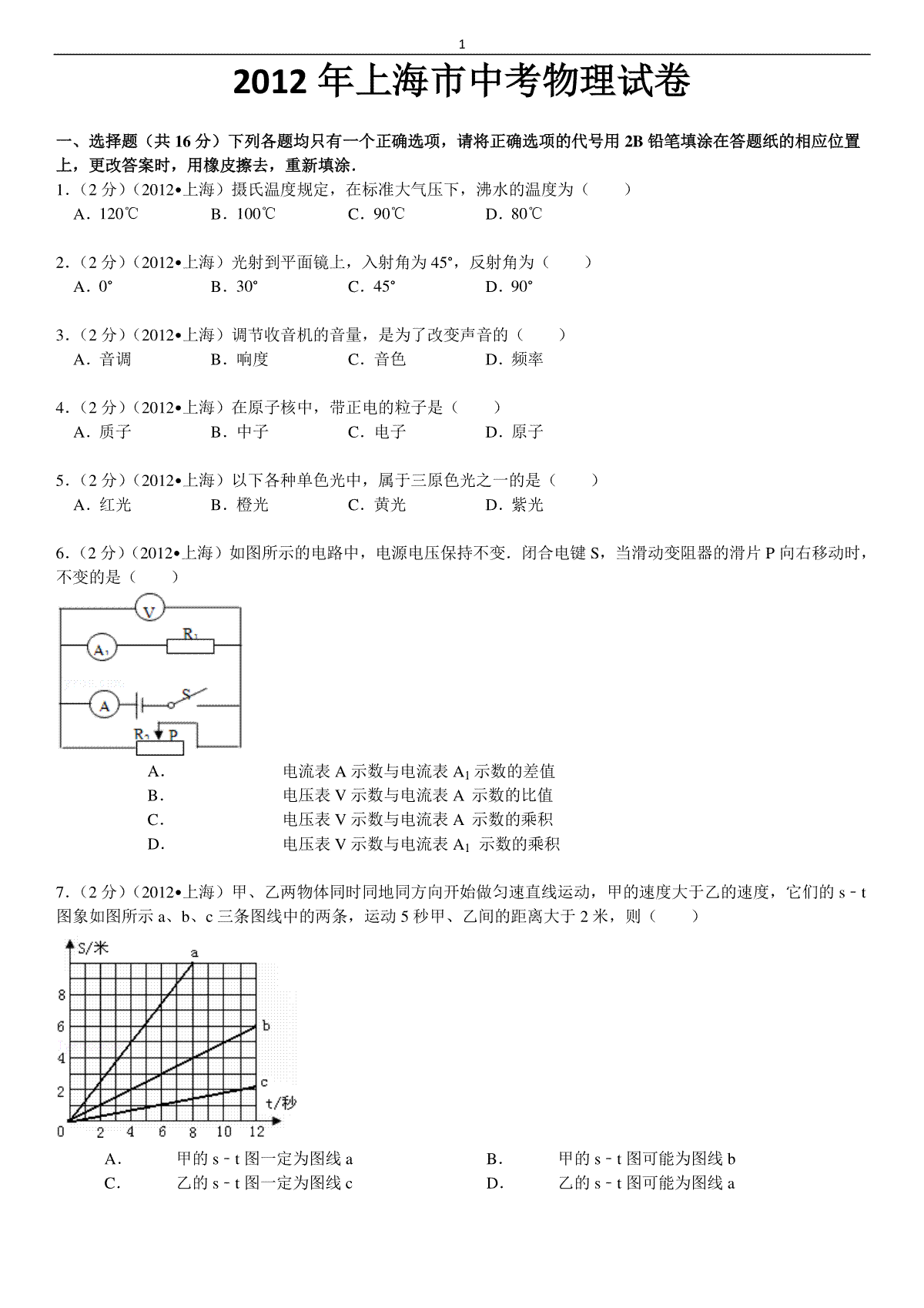 2012年上海市中考物理试题及答案(Word)于近期开考,本次考试对考生对知识的掌握参考价值大,为了方便大家复习掌握错题!小编在下文为大家准备了2012年上海市中考物理试题及答案(Word)试卷及答案解析详情,仅供考生参考。