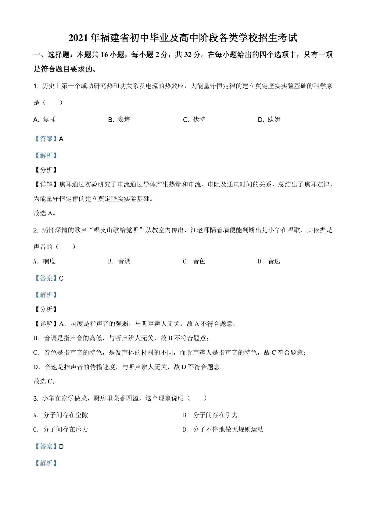 一、精品解析:2021年福建省中考物理试题(解析版)
