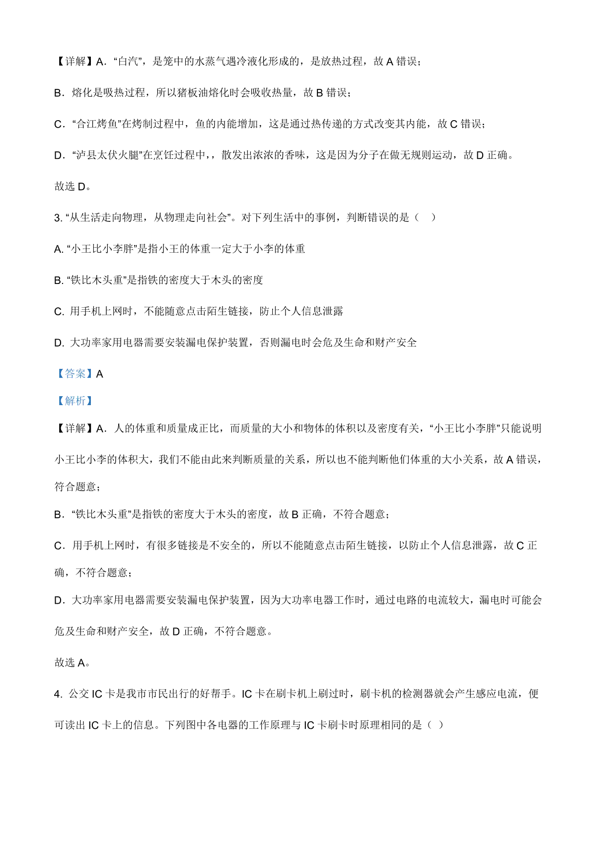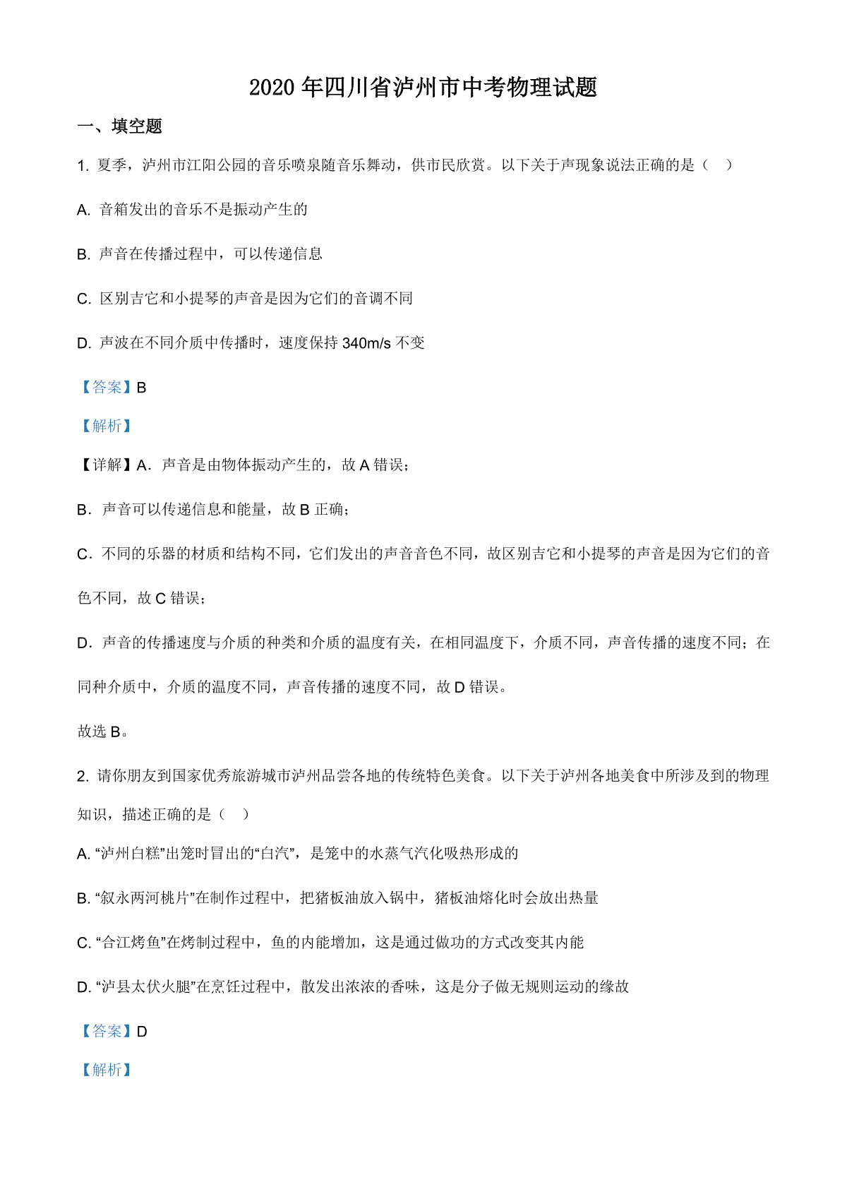 一、精品解析:2020年四川省泸州市中考物理试题(解析版)