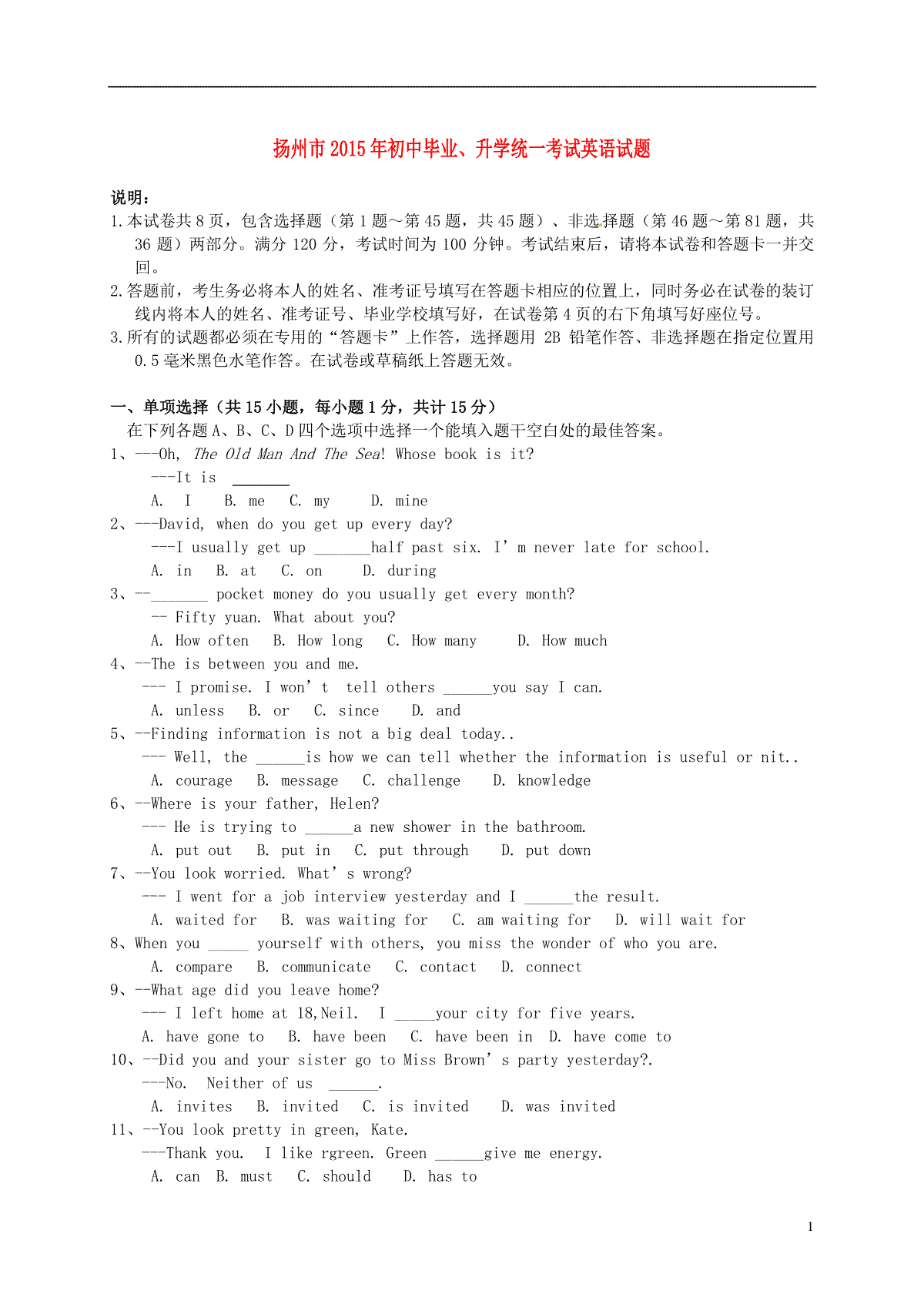 1.江苏省扬州市2015年中考英语真题试题(含答案)