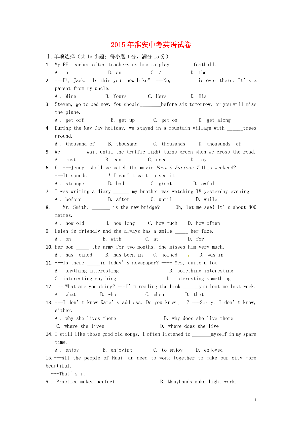 1.江苏省淮安市2015年中考英语真题试题(含答案)