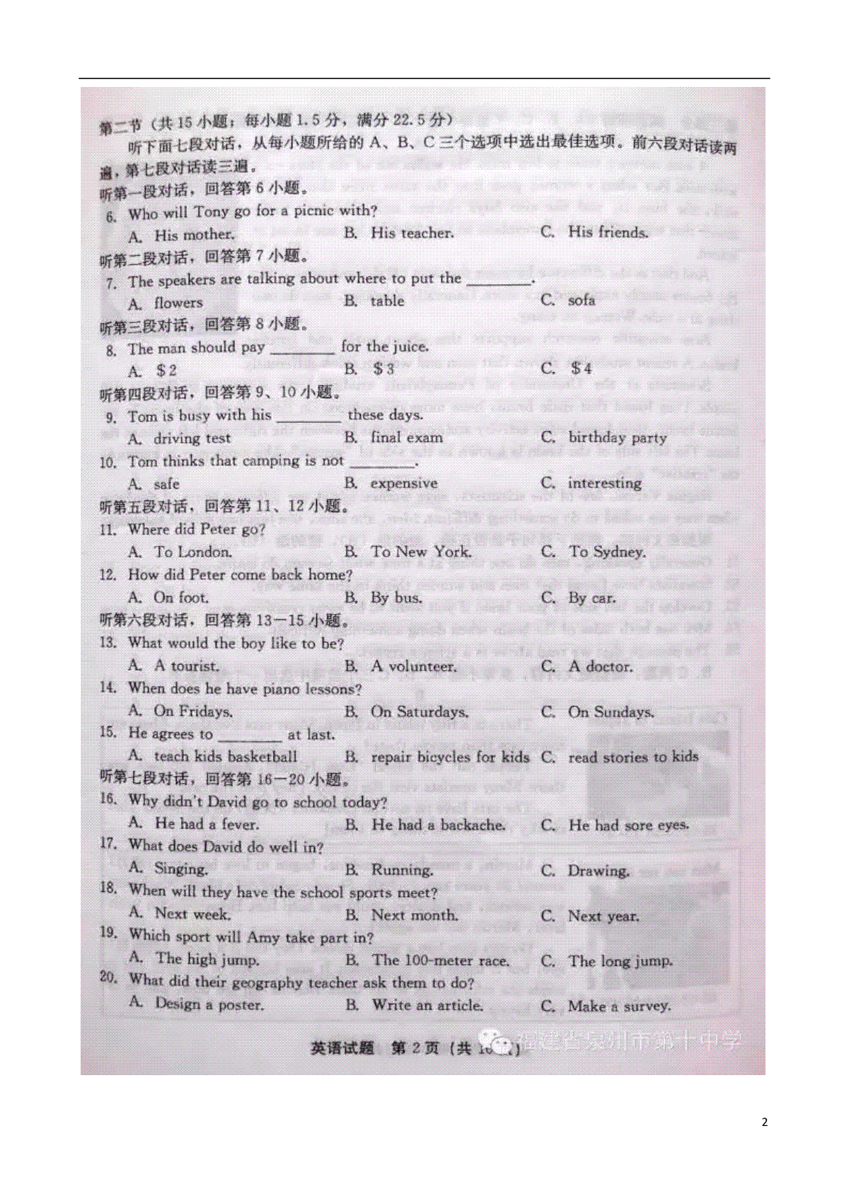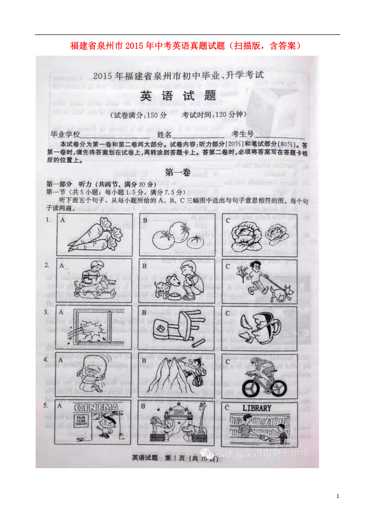 福建省泉州市2015年中考英语真题试题(扫描版,含答案)于近期开考,本次考试对考生对知识的掌握参考价值大,为了方便大家复习掌握错题!小编在下文为大家准备了福建省泉州市2015年中考英语真题试题(扫描版,含答案)试卷及答案解析详情,仅供考生参考。