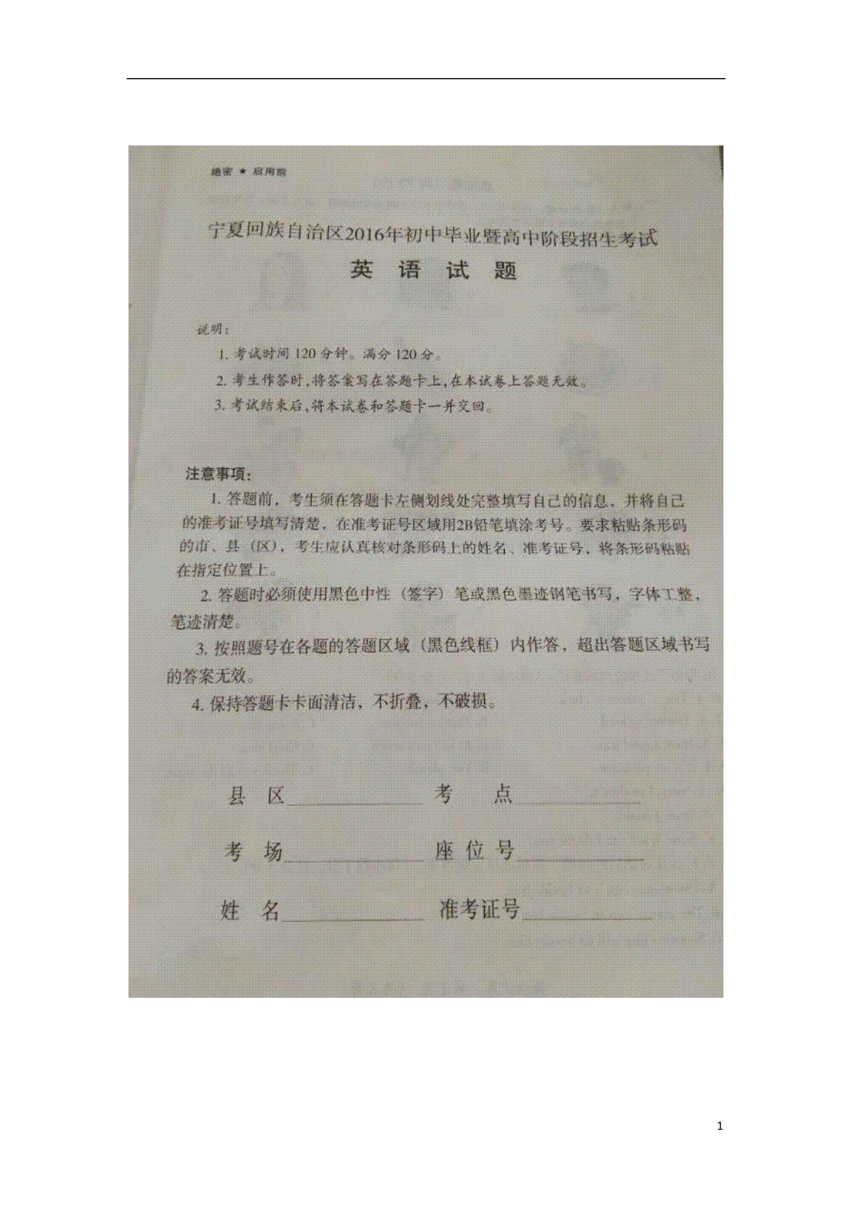 一、宁夏2016年中考英语真题试题(扫描版,含答案)