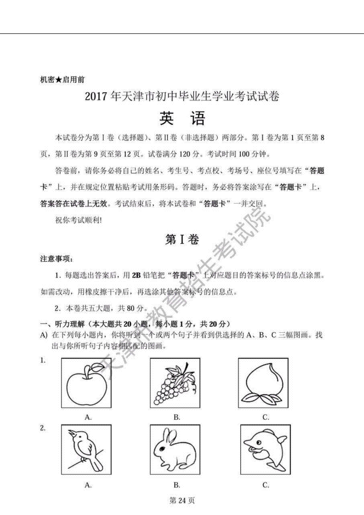 天津市2017年中考英语真题试题扫描版,含答案)于近期开考,本次考试对考生对知识的掌握参考价值大,为了方便大家复习掌握错题!小编在下文为大家准备了天津市2017年中考英语真题试题(扫描版,含答案)试卷及答案解析详情,仅供考生参考。