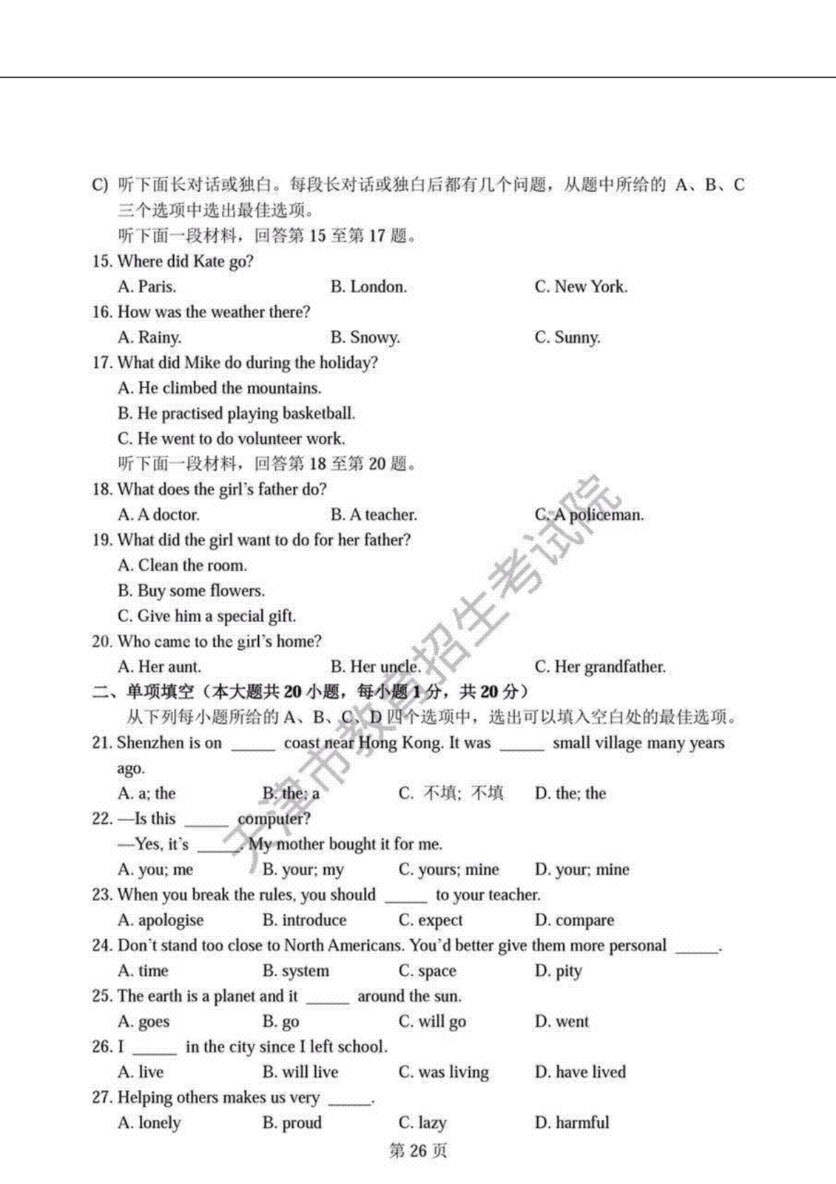 2015年中考真题精品解析 英语(上海卷)精编word版(原卷版)