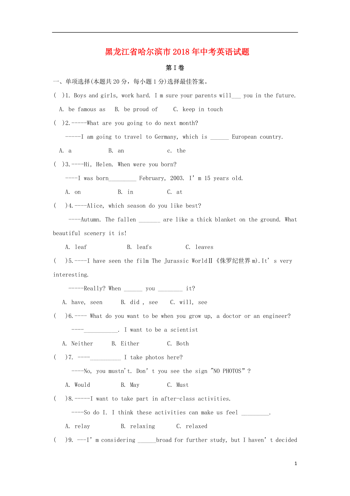 1.黑龙江省哈尔滨市2018年中考英语真题试题(含解析)
