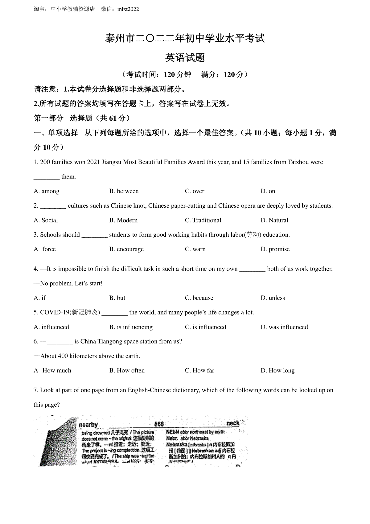 1.精品解析:2022年江苏省泰州市中考英语真题(原卷版)
