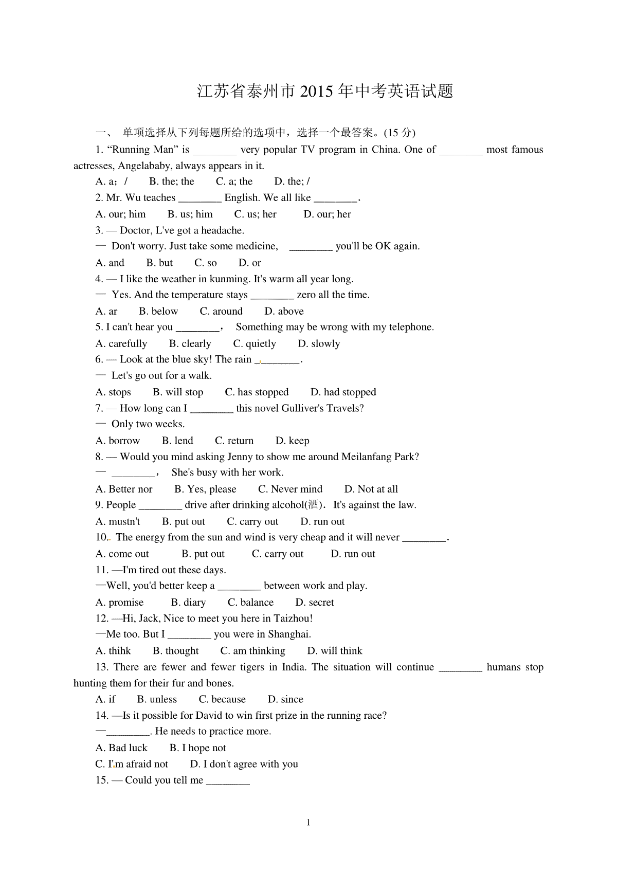 下载2015年江苏省泰州市中考英语试题及答案PDF格式或doc