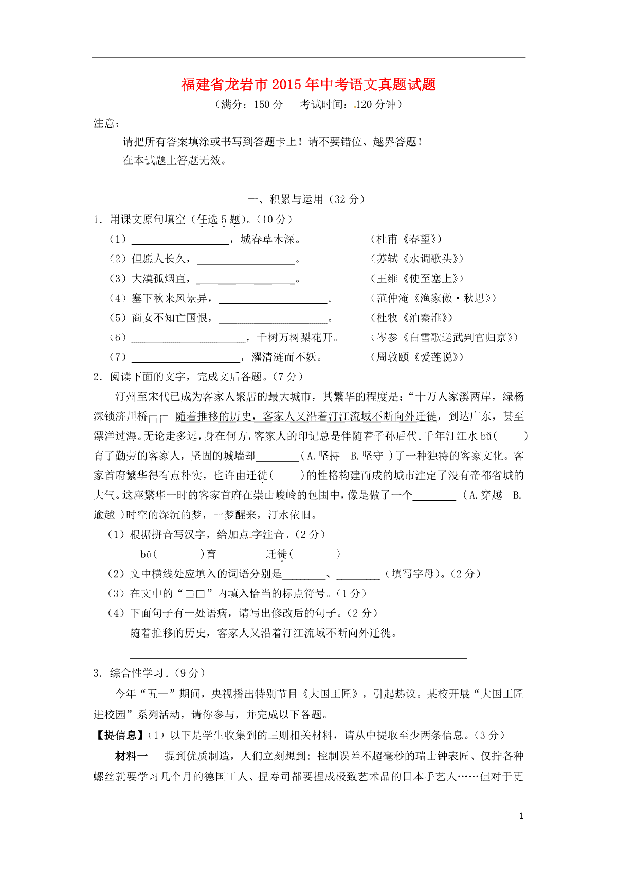 1.福建省龙岩市2015年中考语文真题试题(含答案)