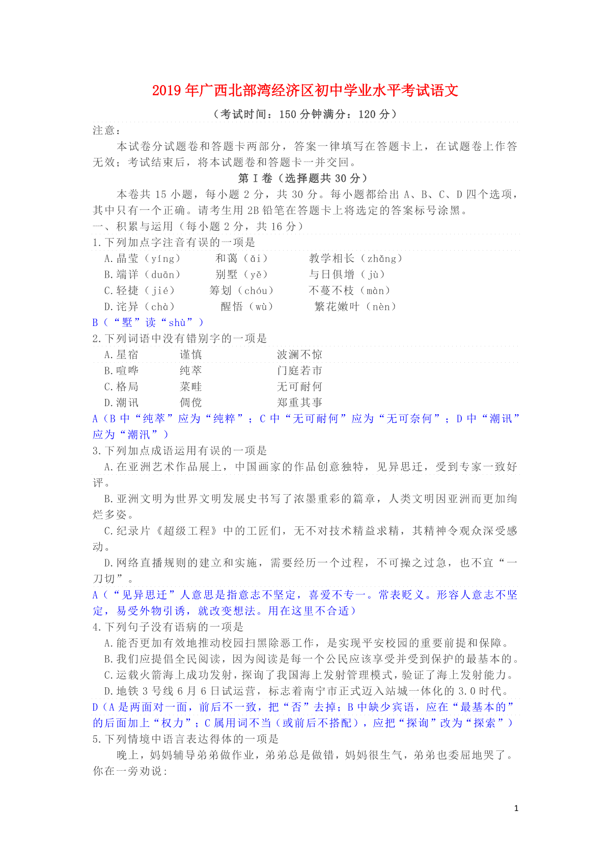 1.广西北部湾经济区2019年中考语文真题试题(含解析)