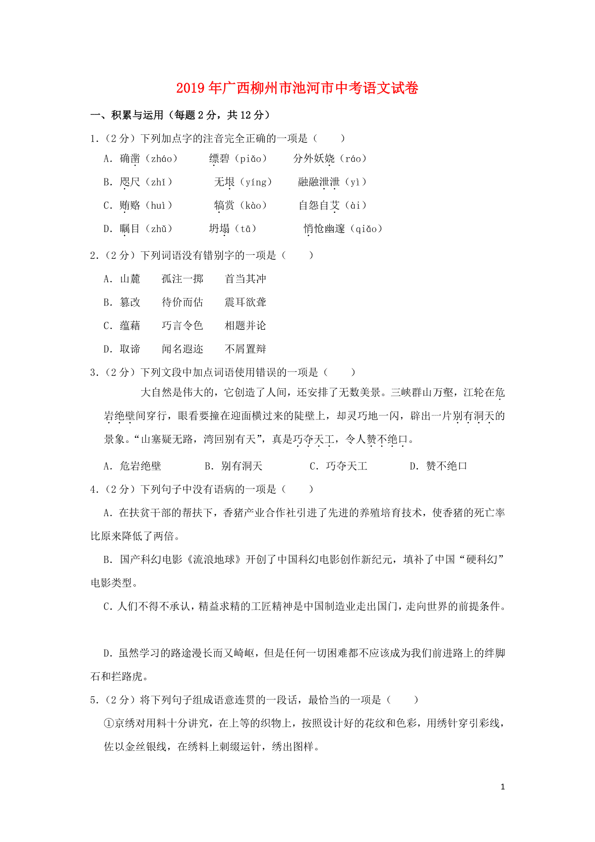 1.广西柳州市池河市2019年中考语文真题试题(含解析)