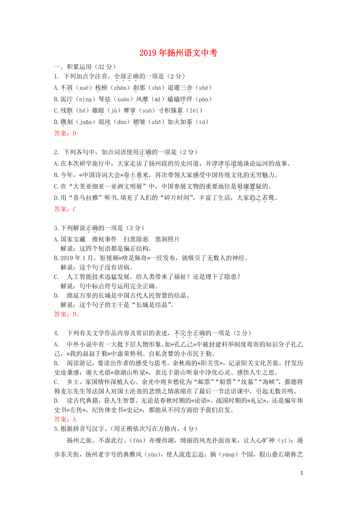 1.江苏省扬州市2019年中考语文真题试题