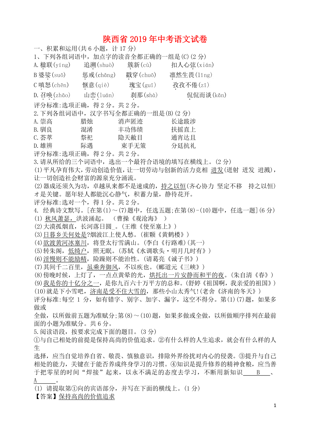1.陕西省2019年中考语文真题试题