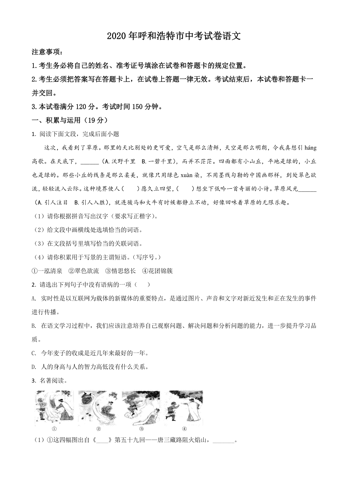 1.精品解析:内蒙古呼和浩特市2020年中考语文试题(原卷版)