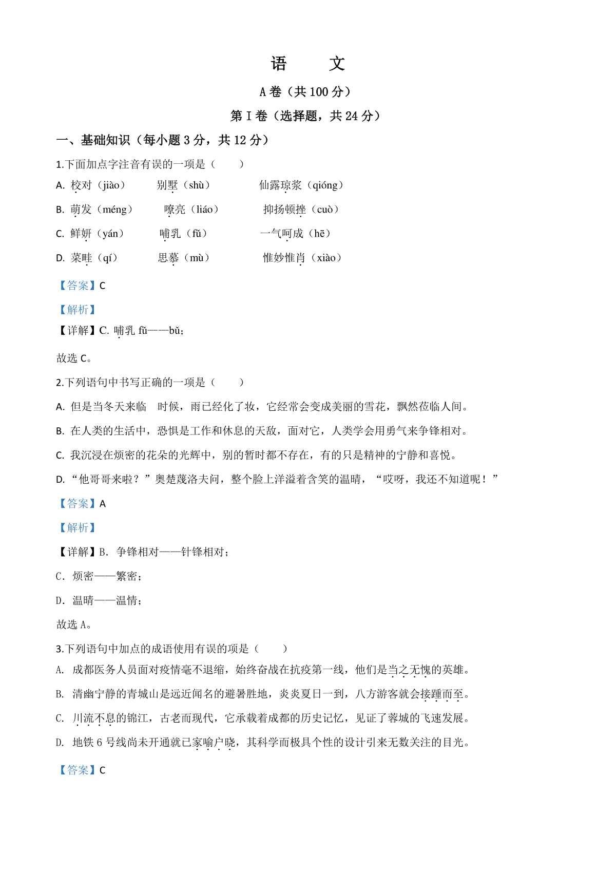 1.精品解析:四川省成都市2020年中考语文试题(解析版)
