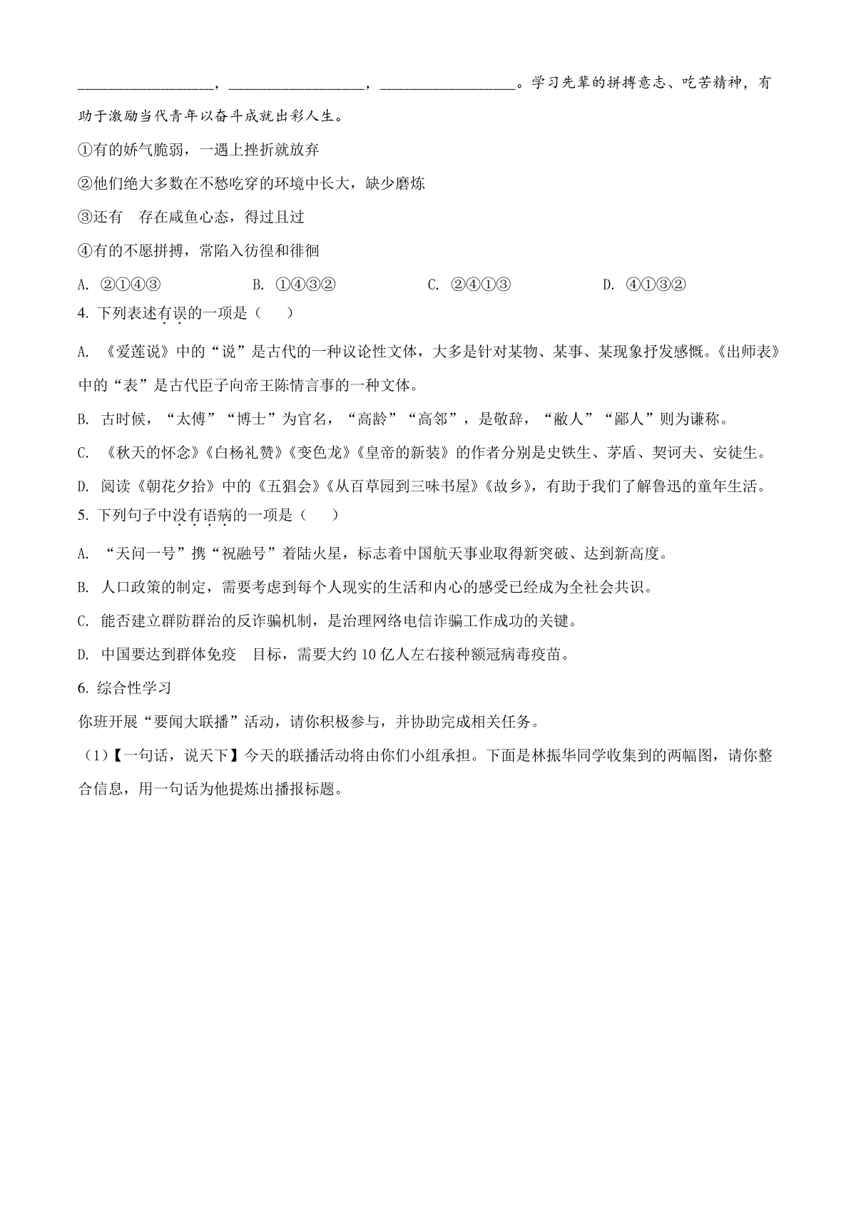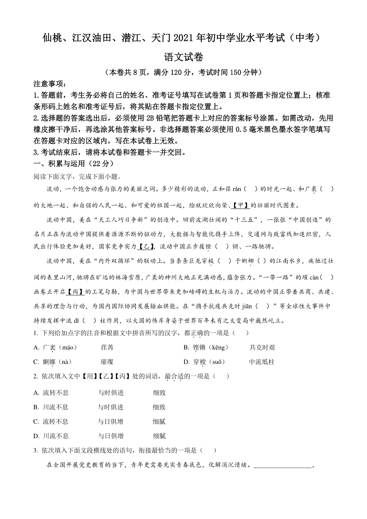 1.湖北省天门、仙桃、潜江、江汉油田2021年中考语文试题(原卷版)
