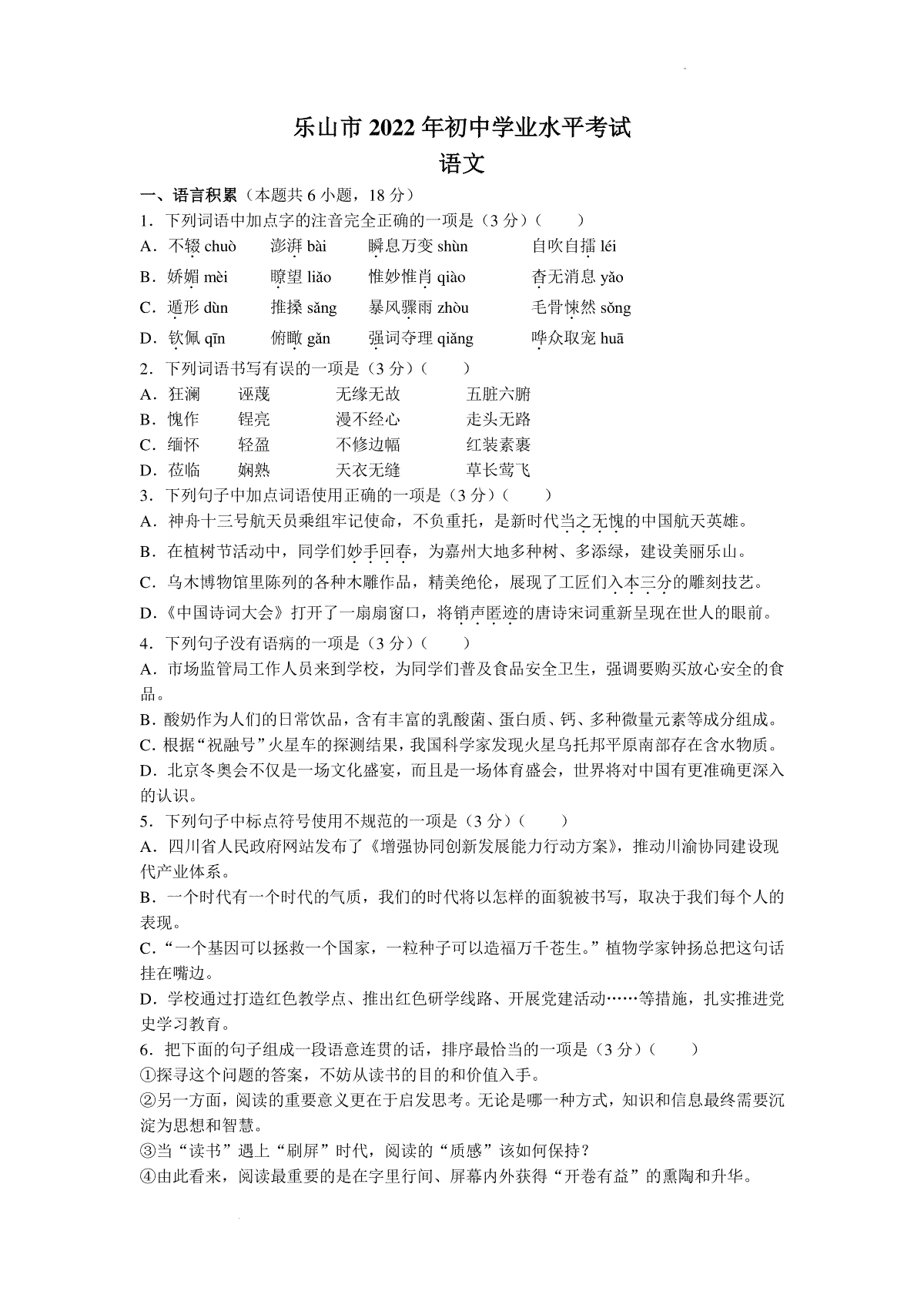 下载2022年四川省乐山市中考语文真题PDF格式或doc