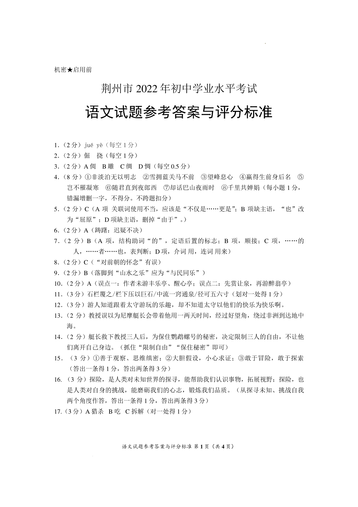 下载2022年湖北省荆州市初中学业水平考试语文试题答案PDF格式或doc