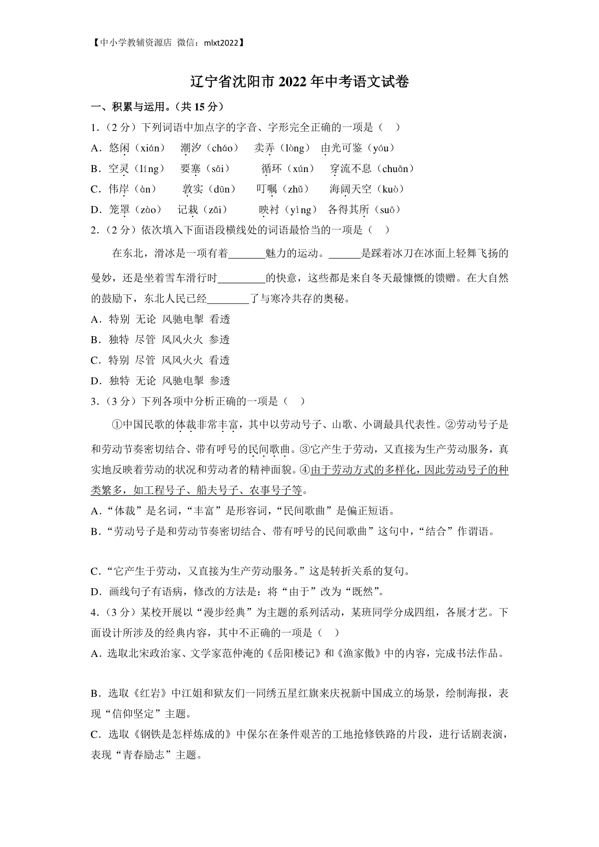 1.2022年辽宁省沈阳市中考语文真题及答案